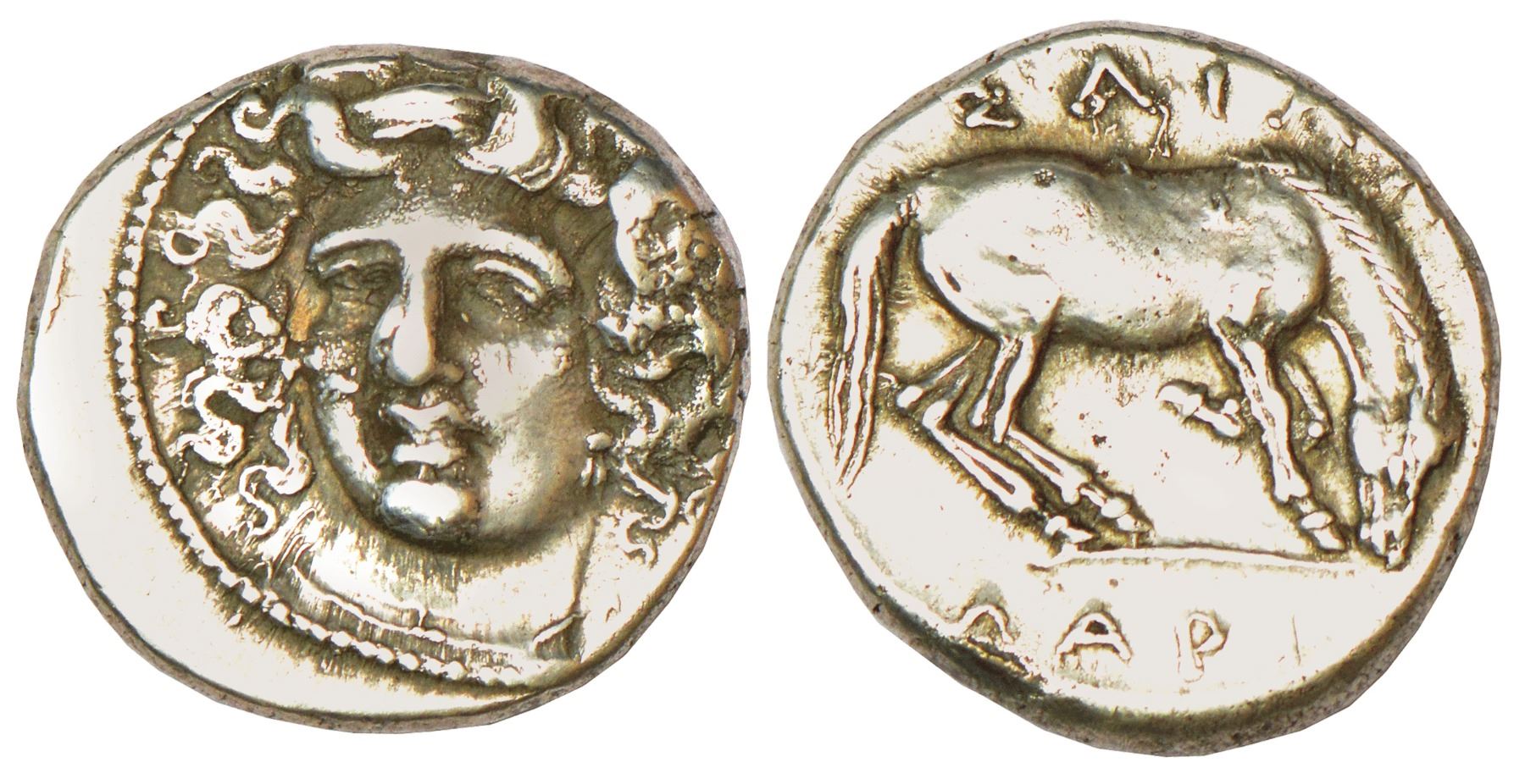 Thessaly, Larissa, silver drachm, late facing head type, (350-325 BC), Sear 2120, 6.08g. Obv: Head of the nymph Larissa facing slightly left, hair knotted in ampyx, wearing single-pendant earring and plain necklace. Rev: Horse standing right with forefoot raised, preparing to lie down; Greek legend LARI below and SAION above.