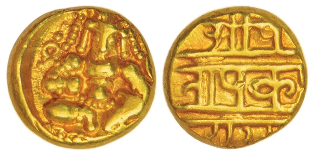 Vijayanagar Kingdom, Tuluva dynasty, gold pagoda of Krishna Devaraya (1509-1530 AD), Girijapathi 156-160, 3.35g.Obv: Balakrishna seated facing. Rev: Devanagari legend Sri Pra/tapa Krishna/raya in three lines.
