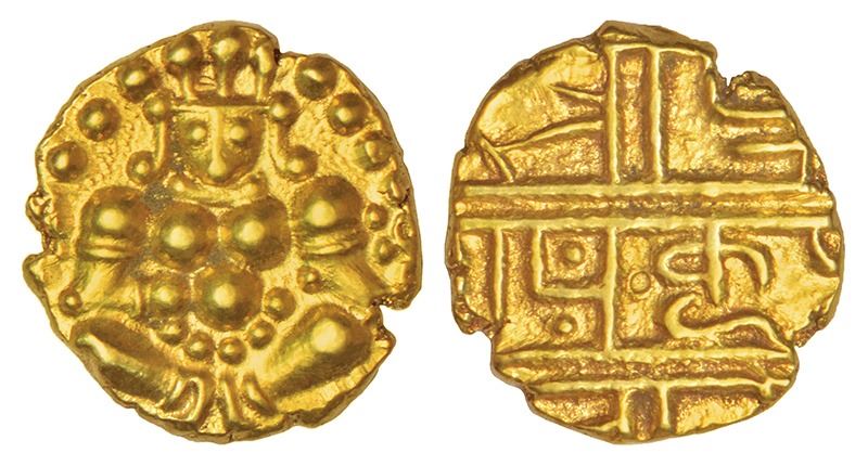 Medieval India: Vijayanagar Kingdom, Tuluva dynasty, gold pagoda of Krishna Devaraya (1509-1530 AD), Girijapathi 160, 3.30g. Obv: Balakrishna seated facing. Rev: Devanagari legend Sri Pra/tapa Krishna/raya in three lines.
