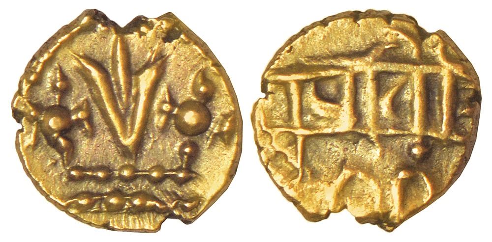 Vijayanagara Empire - late phase as Kings of Chandragiri/Penukonda, gold fanam, feudatory issue in the name of Venkatapati Raya, (c.1600-1700 AD), not in MCSI, 0.35g. Obv: Vadakkalai Nāmam (Vaishnavite symbol) on a pedestal, flanked by Sankha and Chakra. Rev: Legend …pati Raya in two lines.