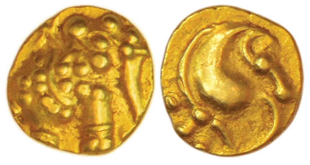 Western Gangas (10th-11th century AD), gold gajapati fanam, MCSI-I 195-196, 0.38g. Obv: An ornate elephant standing facing right. Rev: Ornamental floral scroll.