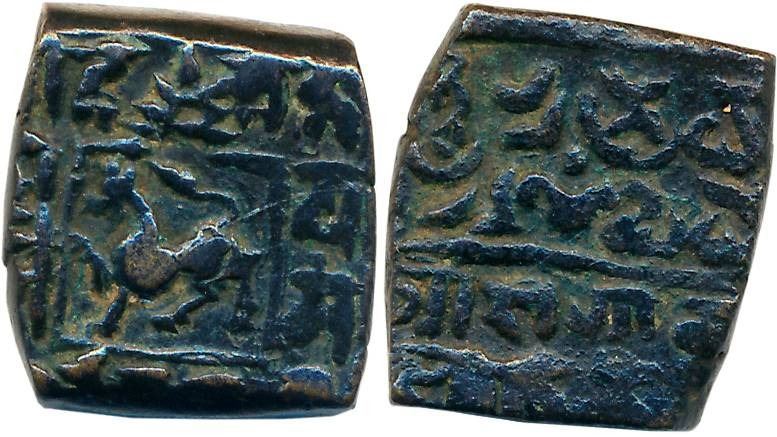 Gond Kingdom of Garha, Katanga, Sangram Shah, Copper Unit, 7.89g, Obv: Lion with forepaw raised facing left within a rectangle, Devnagari legend “Shri Hariharaya Namah” followed by a last line, which is truncated, Rev: Legend “Shri Sangrama Sahi” inscribed in Telugu (upper half) and in Devnagari lower half. Extremely fine, exceedingly rare.