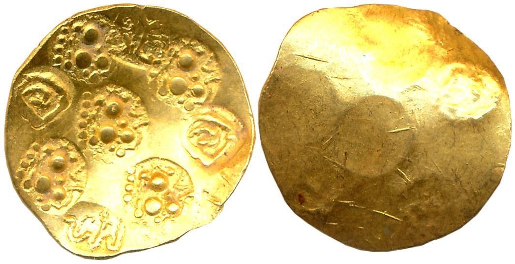 Nolambas of South, Central Karnataka or their Feudatories, possibly attributed to Nanni Nolamba or “Polalachora’”, Gold Punch Marked Gadyana, 3.74g, Uniface, Obv: Nine punches – 5 x Nandi seated facing right, 2 x Kannada letter ‘Shri’, 1 x Kannada letters “Pa La…” (engraved retrograde), 1 x Ankusha and weapon symbols. Extremely fine, very rare.