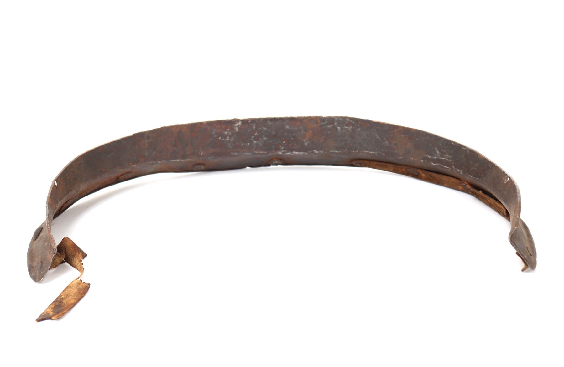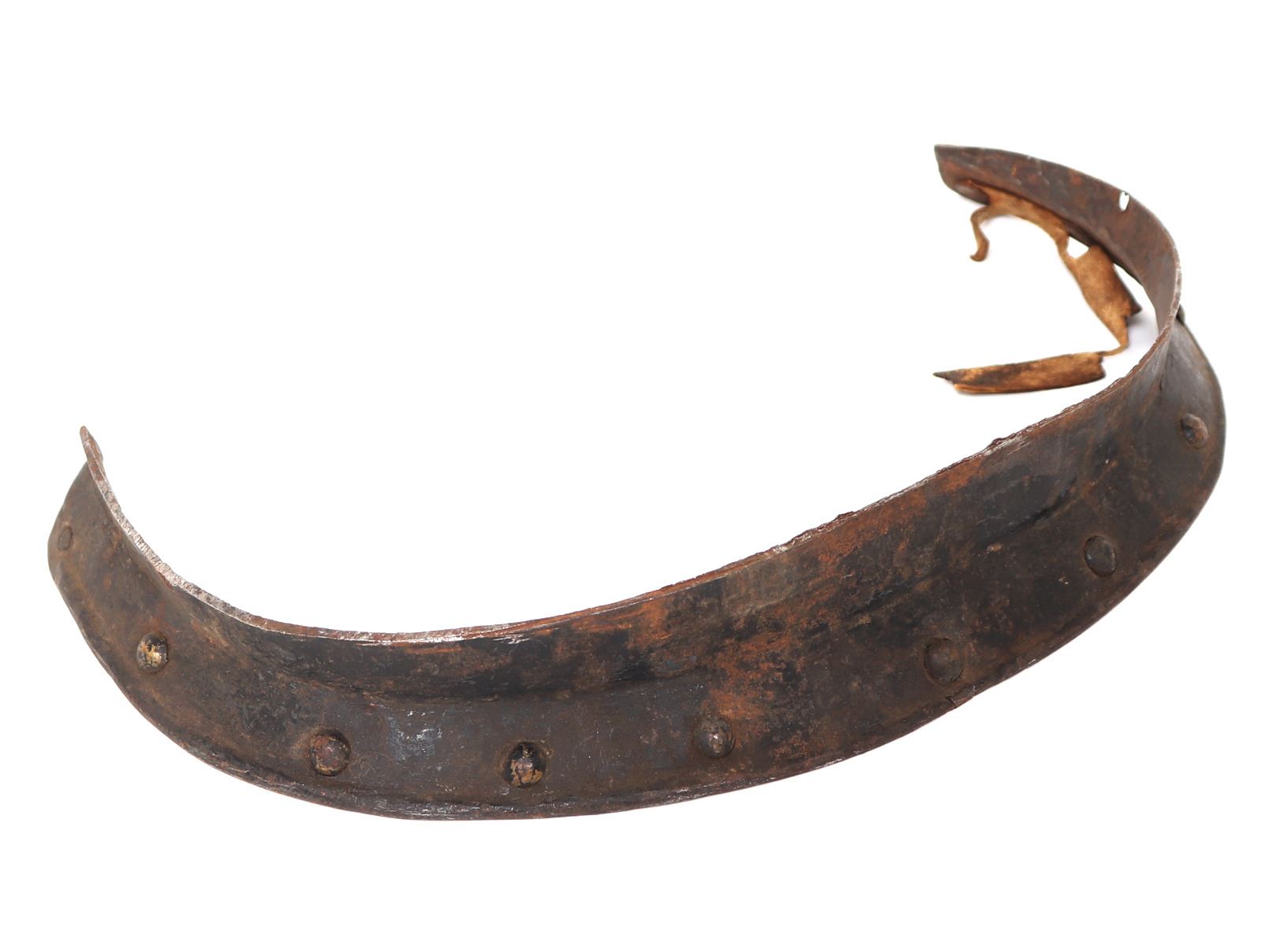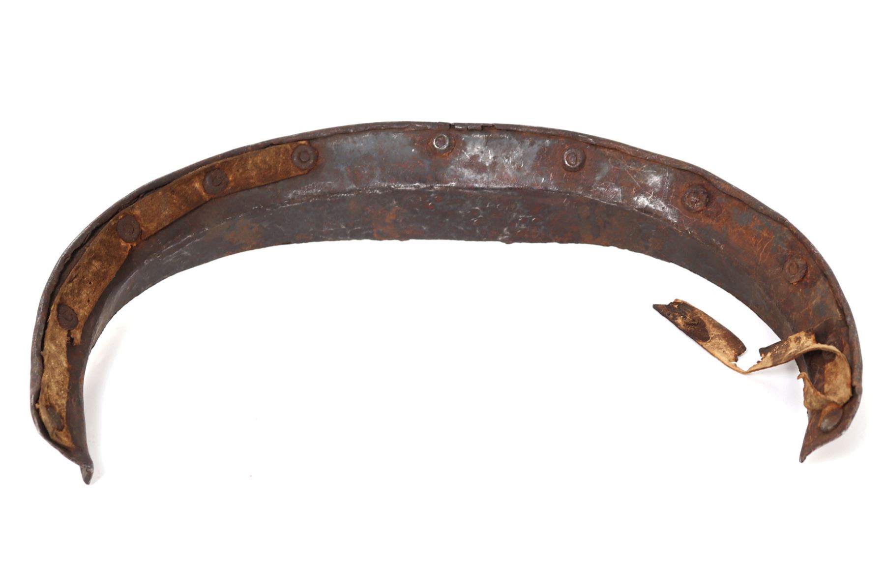 Medieval element of armour rear cutlet lame, 17th century. Thick steel plate of armour with a lower rolled edge and heavy oversized gilt brass rivets. The lower most lame of a rear backplate for a cuirass armour. Size 12" W. Condition: Oxidization and wear commensurate with age and use.. Provenance: Ex-Southern California Collection, Ex-Thomas Del Mar, Ex-John Woodman Higgins Armory Museum