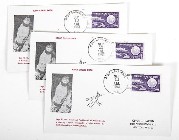 Mercury Launch Covers. Three identical covers (one with minor adhesion on the reverse) commemorating the launch of Mercury- Atlas 4 on 9/13/61. This flight, launched from complex 14 at Cape Canaveral was the first successful orbital flight test of the Mercury program. "The payload consisted of a pilot simulator (to test the environmental controls), two voice tapes (to check the tracking network), a life support system, three cameras, and instrumentation to monitor levels of noise, vibration and radiation. It demonstrated the ability of the Atlas LV-3B rocket to lift the Mercury capsule into orbit, the capsule and its systems to operate completely autonomously, and succeeded in obtaining pictures of the Earth". Scarce and attractive. Ex. the Michael Orenstein Estate Collection.