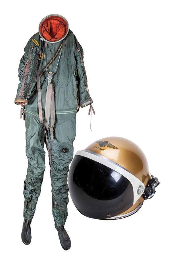 Mercury Program, 1961, Usn Mk Iv, Mod 1, Type 1 Pressure Suit and Helmet. This green USN Mk IV high altitude, full pressure suit was made by B. F. Goodrich. It includes the helmet, full neck ring and a pressure gauge on the thigh. A gold USN patch on the chest and right shoulder plus a US Navy patch (blue) on the left shoulder. The integrated cloth shoes are included (the gloves are omitted). Some zipper and rubber faults as would be expected, but the suit is in overall very good condition.