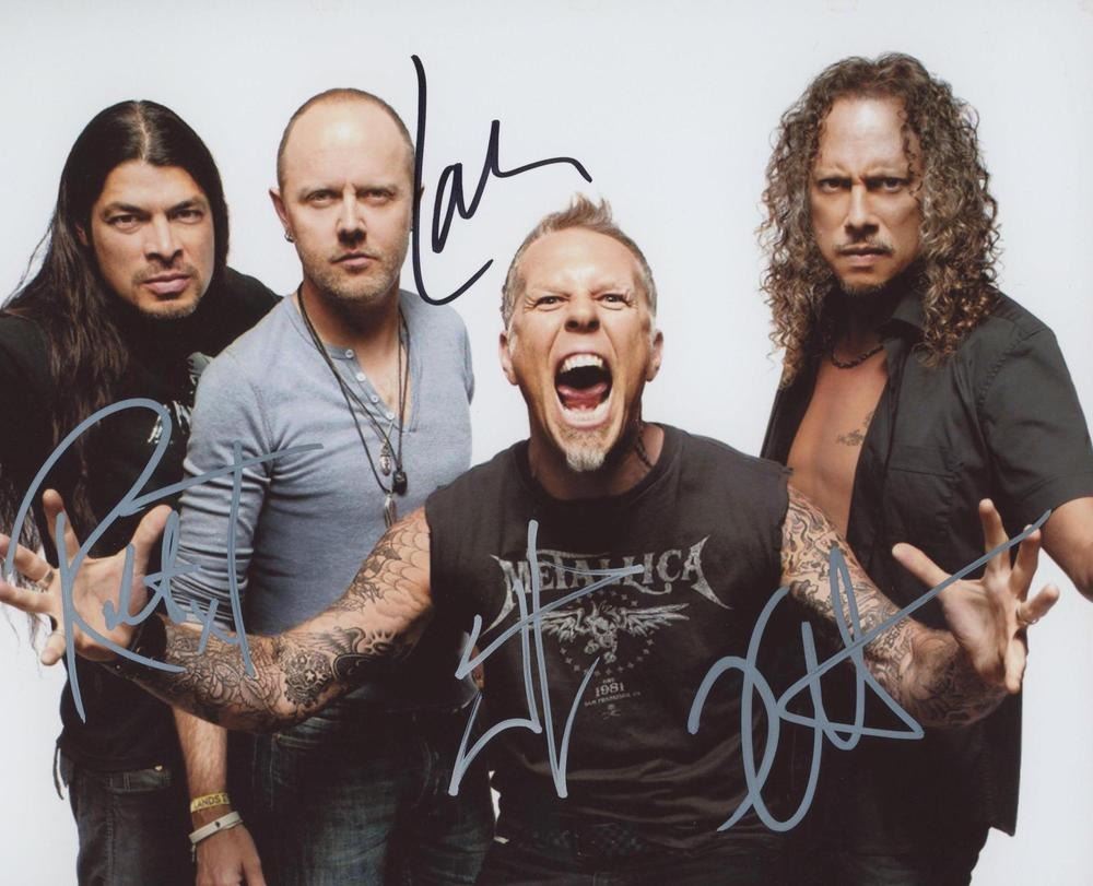 Metallica signed photo autographed by Lars Ulrich, Kirk Hammett, Robert Trujillo, and Jason Newsted. 8x10 in. This item is a reprint of an original autograph.