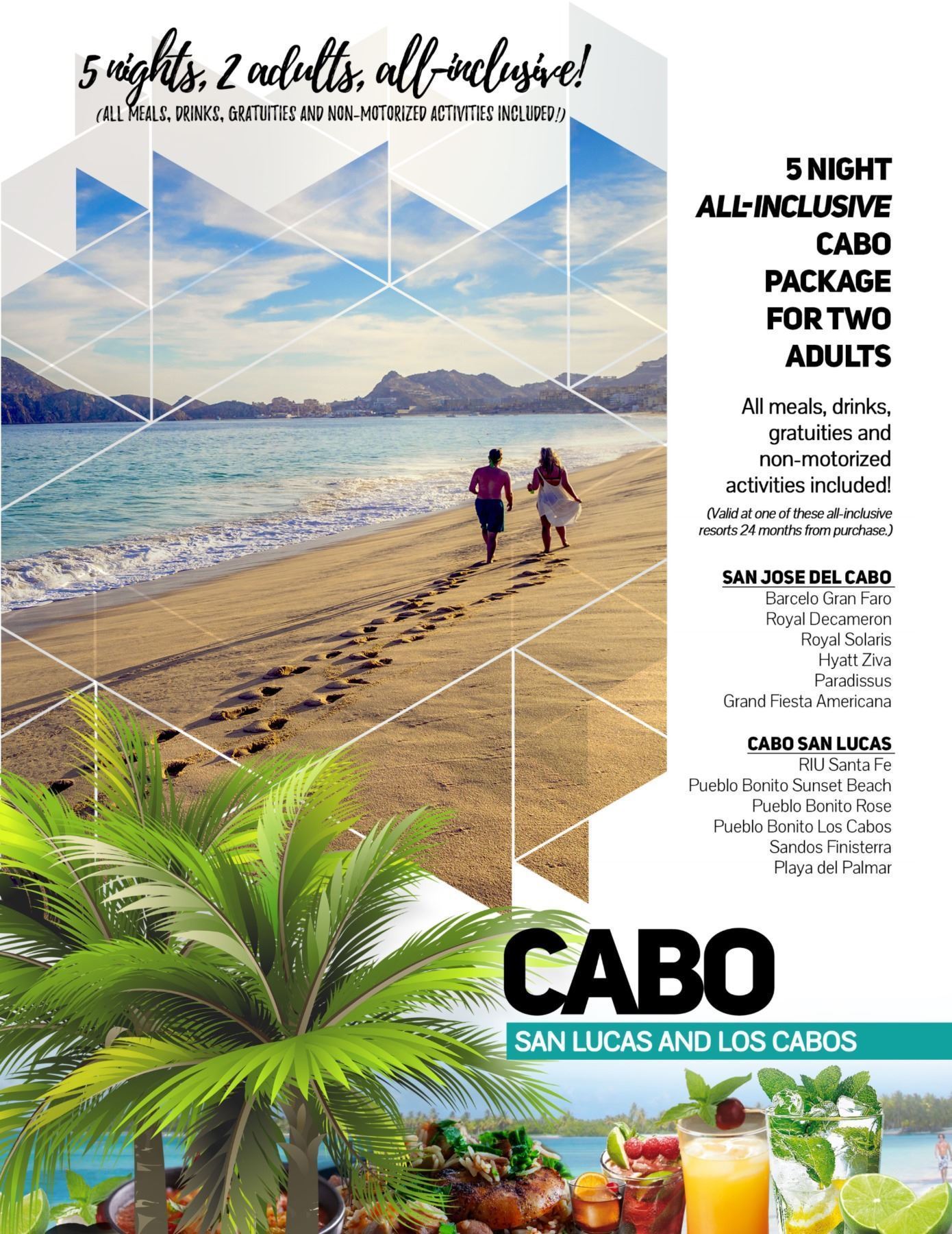 Cabo San Lucas and Los Cabos, 5 Night all-inclusive vacation for two adults. This vacation package offers you a choice of 12 different all-inclusive resorts to choose from, six in San Jose Del Cabo and six in Cabo San Lucas and with this worry-free vacation, you will have plenty of time to explore and enjoy one of the many adventures available to you on and off the shores of the Sea of Cortez.