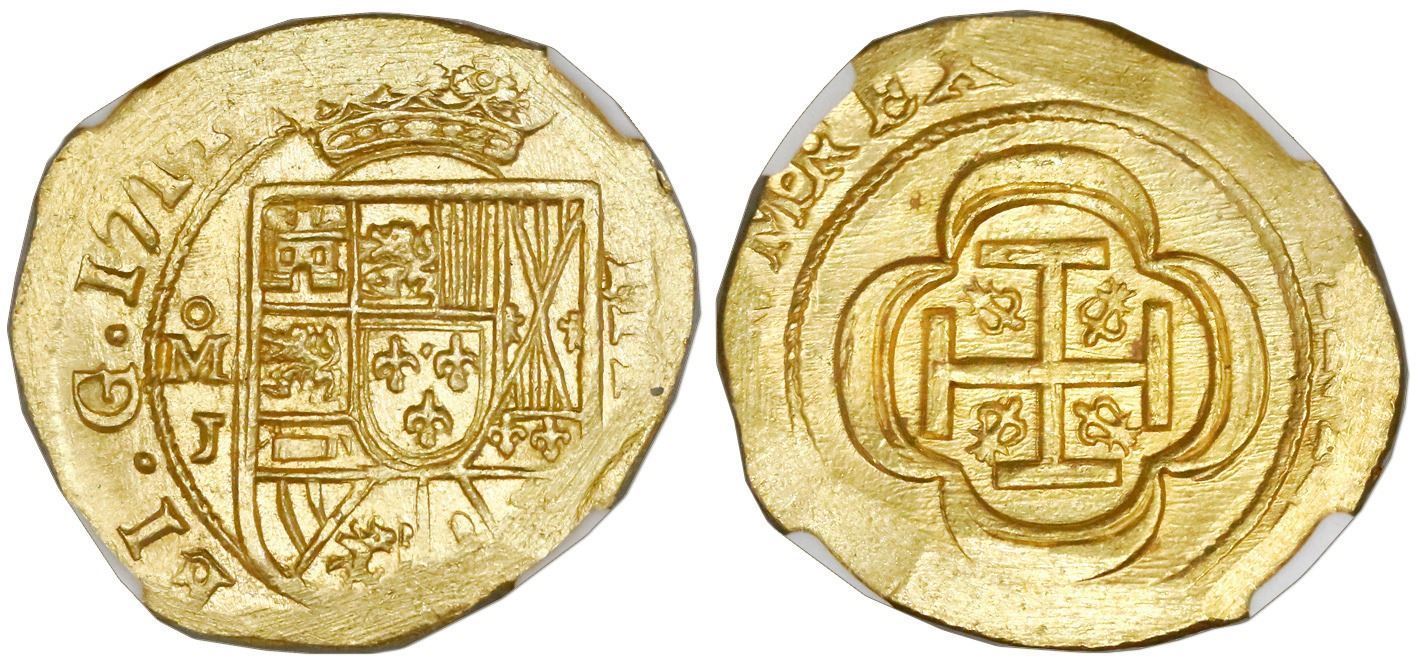 Mexico City, Mexico, cob 4 escudos, 1714J, NGC MS 65, tied for finest known in NGC census, ex-1715 Fleet (designated on label). S-M30; KM-55.2; CT-234. 13.5 grams. Incredibly lustrous and sharply detailed, with superb full cross, nearly full date and crown and shield, full oMJ, clearly a piece that was among the very first strikes for these dies. From the 1715 Fleet. NGC #2062762-023.