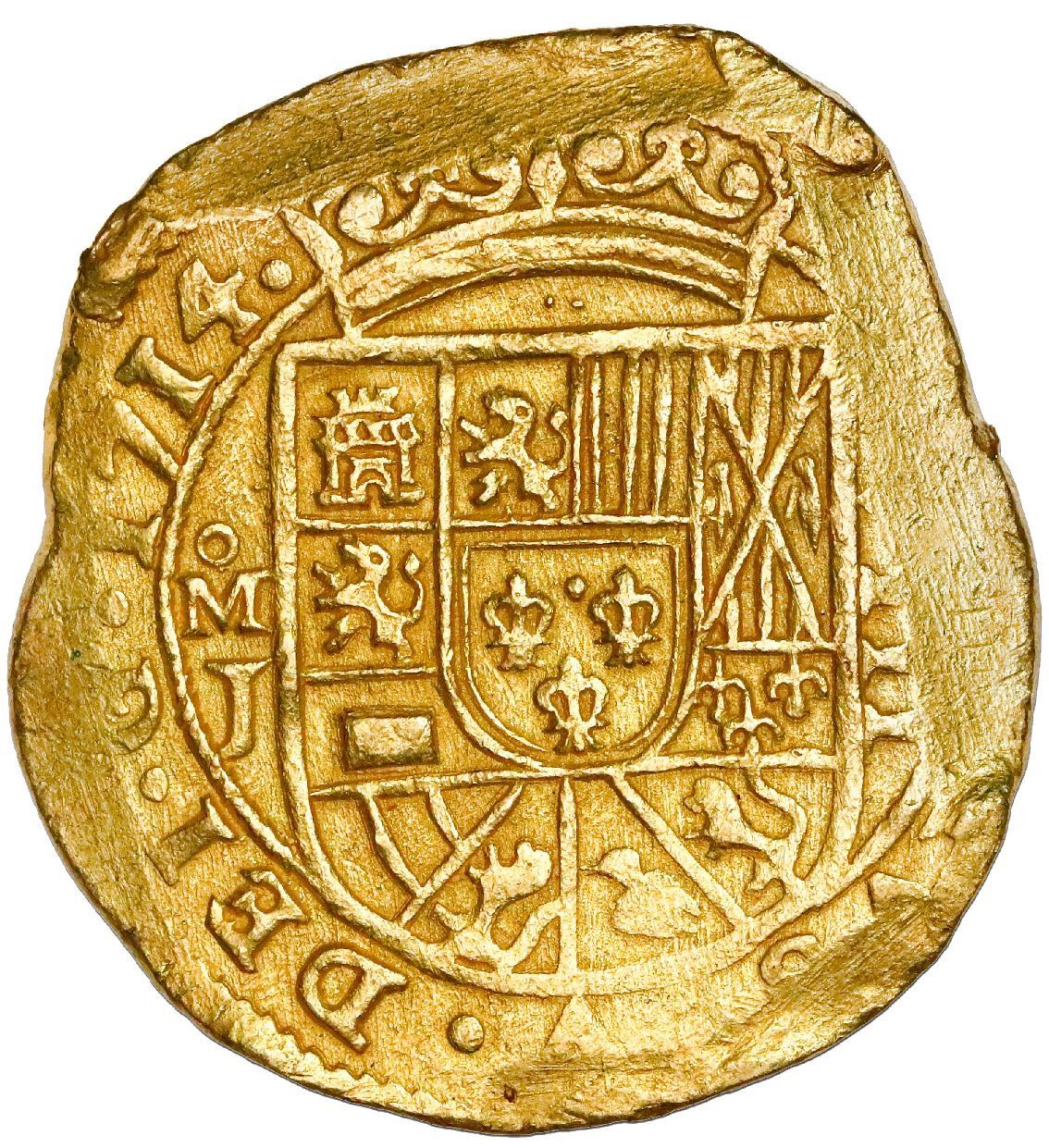 Mexico City, Mexico, cob 8 escudos, 1714J, NGC MS 62, ex-1715 Fleet (designated on special label), ex-Ullian. S-M30; KM-57.2; Cal-2213. 26.94 grams. Excellent full cross-and-tressure and well-detailed shield, full date and oMJ, nearly full crown, and with even part of the denomination and king's ordinal V visible, light yellow color with trace of luster, a premium specimen with a desirable provenance. NGC #5939652-001. From the 1715 Fleet, with photo-certificate signed by Louis Ullian.