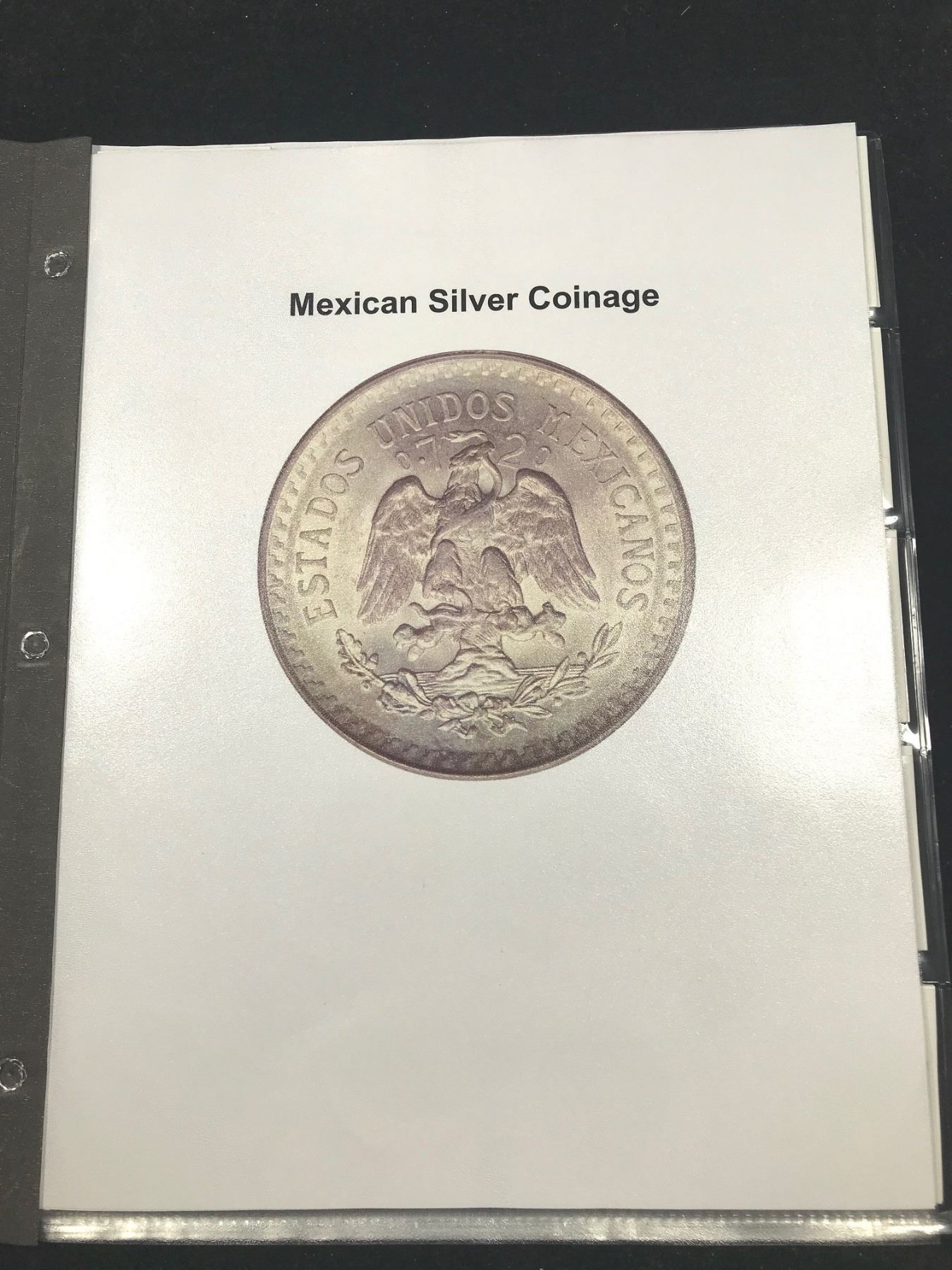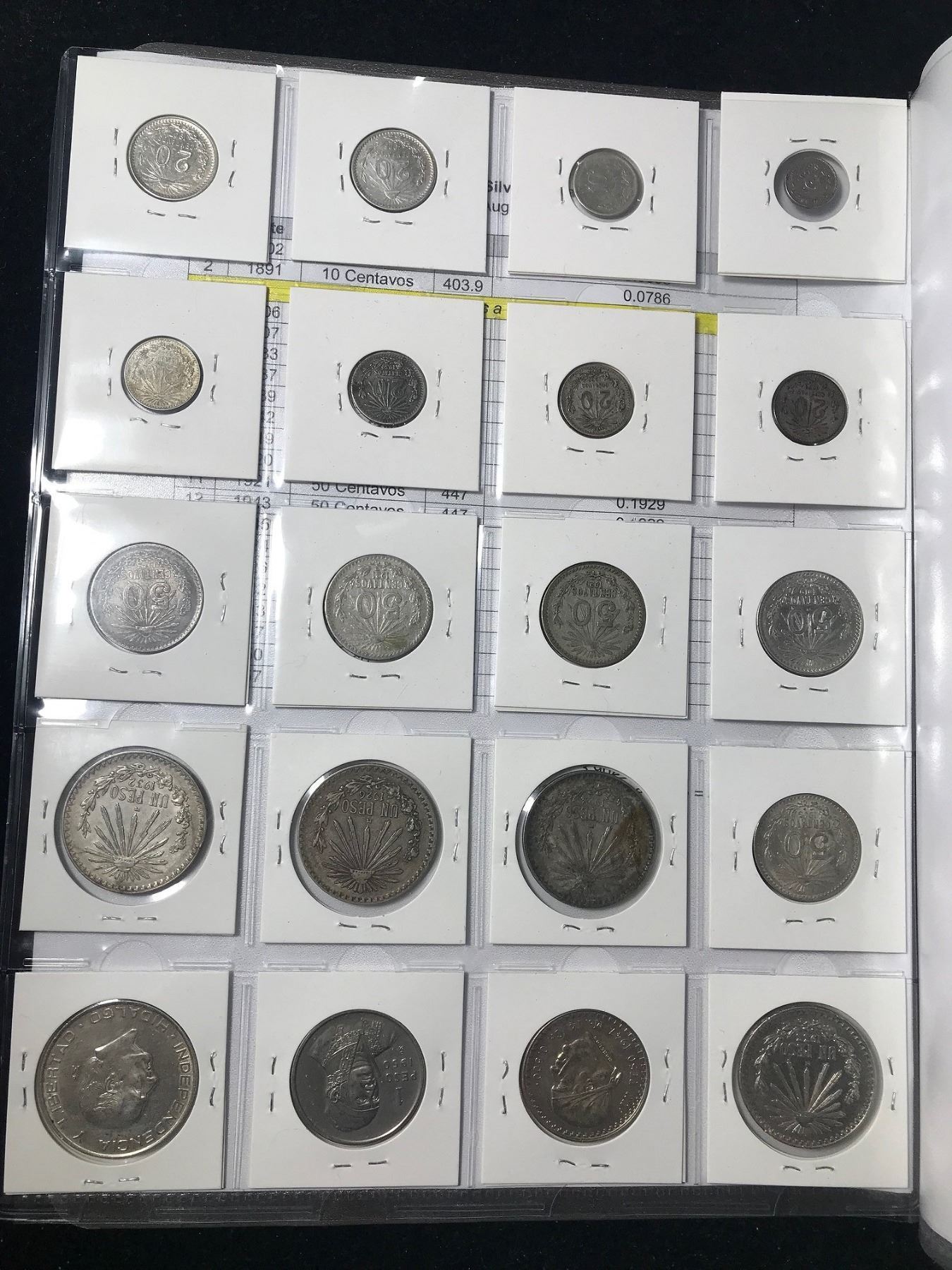 A nice representation of 20 Mexican Silver Coins, Consisting of: 5 Centavos 1902, 10 Centavos 1891, 20 Centavos X 6 pieces, 1906-1942; 50 Centavos X 5 pieces, 1919-1945; Peso X 6 pieces, 1924-1950; together with a single Five Pesos of 1957. All in varying grades of preservation, housed in 2x2's in black folder with a few pages of nicely assembled historical detail. With total Silver content of 3.96 oz, and estimated catalogue falue of $200