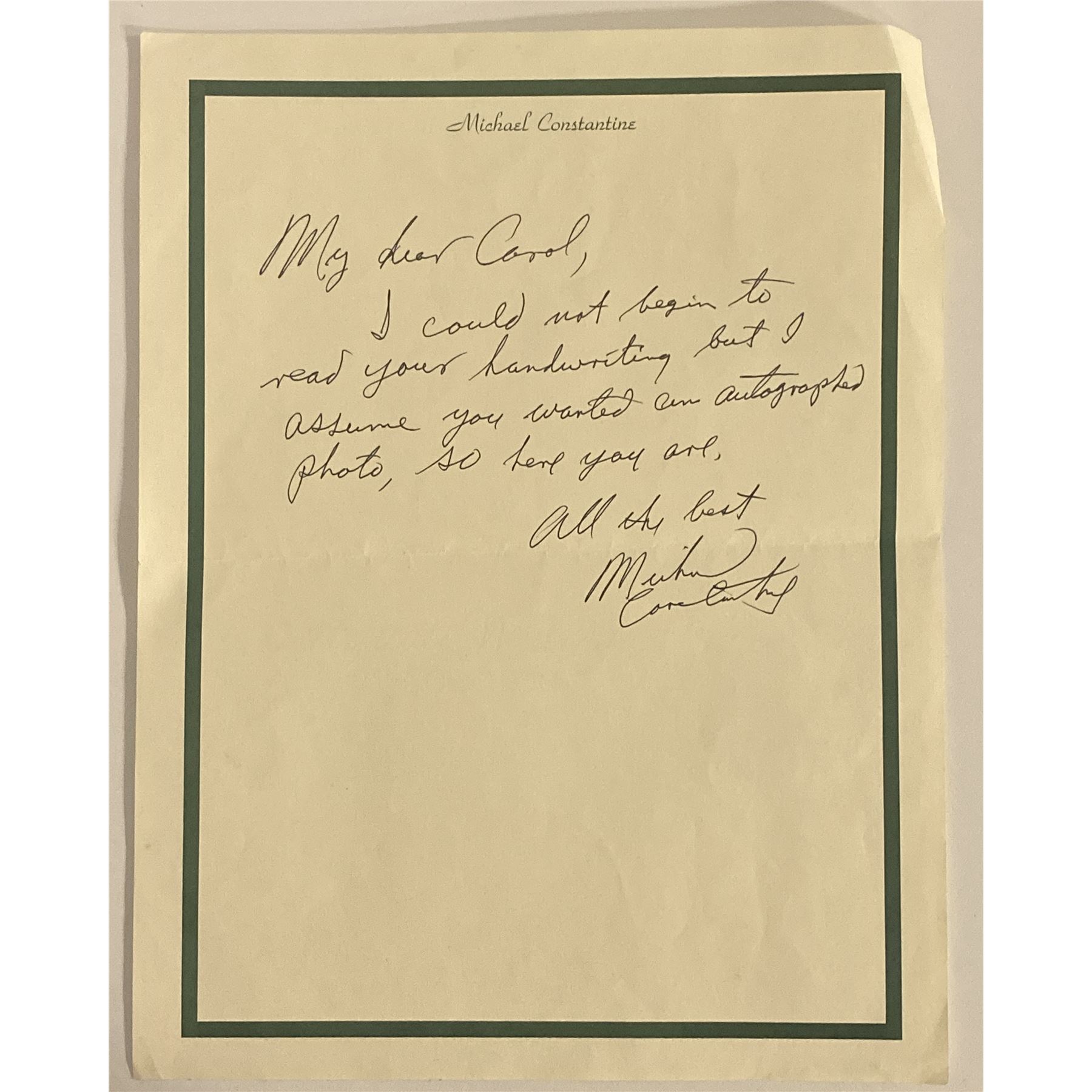 Michael Constantine signed letter.9x12 inches