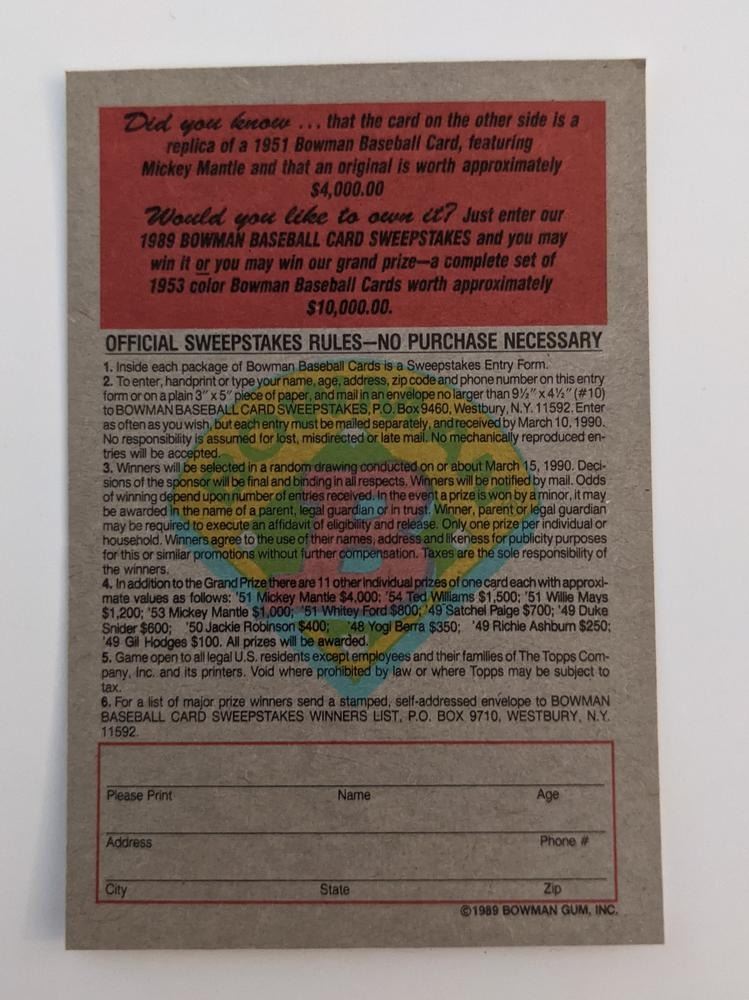 Mickey Mantle 1951 Bowman Baseball Card Replica - 1989