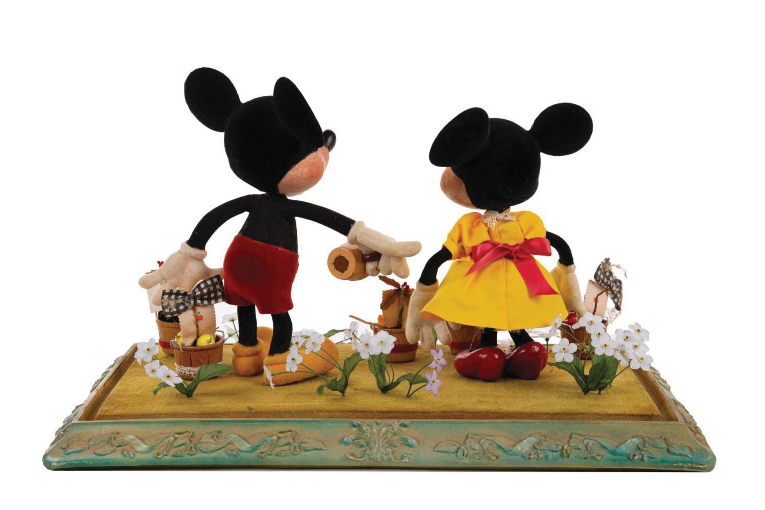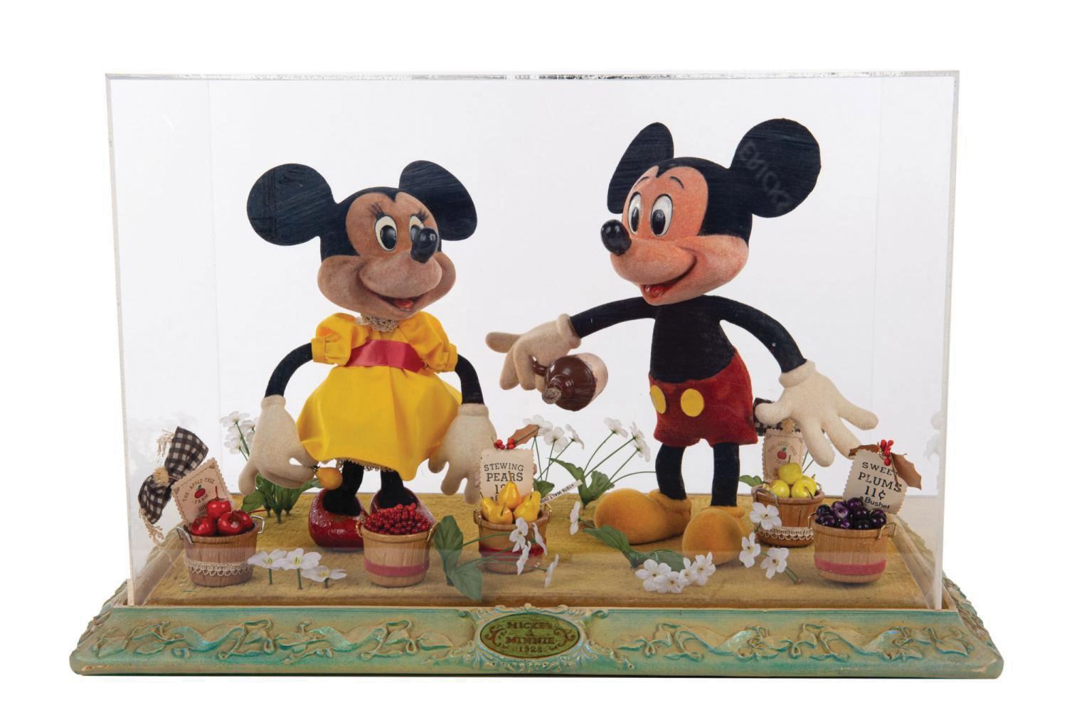 (Disneyland, 1978) A Mickey Mouse & Minnie Mouse display created exclusively for sale through the Disneyana shop at Disneyland. Custom made by the same designers who would create the popular Main Street window displays, this Mickey and Minnie mixed media display featuring flocked felt coated foam figures mounted to a custom decorative base and enclosed within an acrylic case. Measuring 13.25" tall with a 20.5"x12.25" base, the character display is in fine condition with minor surface wear.