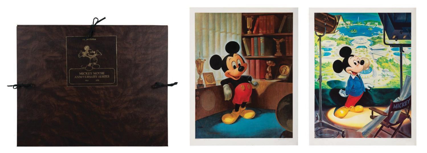 (Disney, c.1978) A pair of limited edition lithographic prints of Mickey Mouse's Portrait signed by Imagineer John Hench. These portraits were originally created by Hench for the corporate icon's 25th and 50th birthdays. Each print is signed by John Hench, hand-numbered 582/750, and feature the official Walt Disney Archives seal. Measuring 22"x17", the fine condition prints exhibit slight wear to edges, and come protected inside their original 24"x19" good condition portfolio with minor wear to folds.