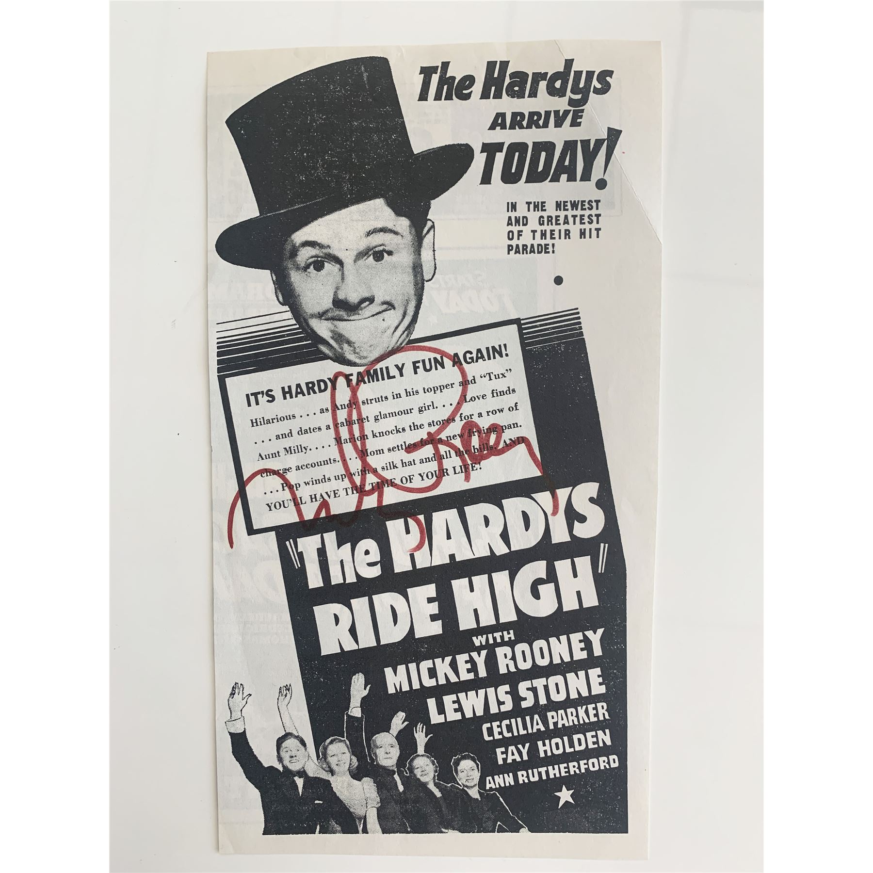 The Hardys Ride High (1939) Movie Advertisement Autographed by Mickey Rooney. 5x10inches