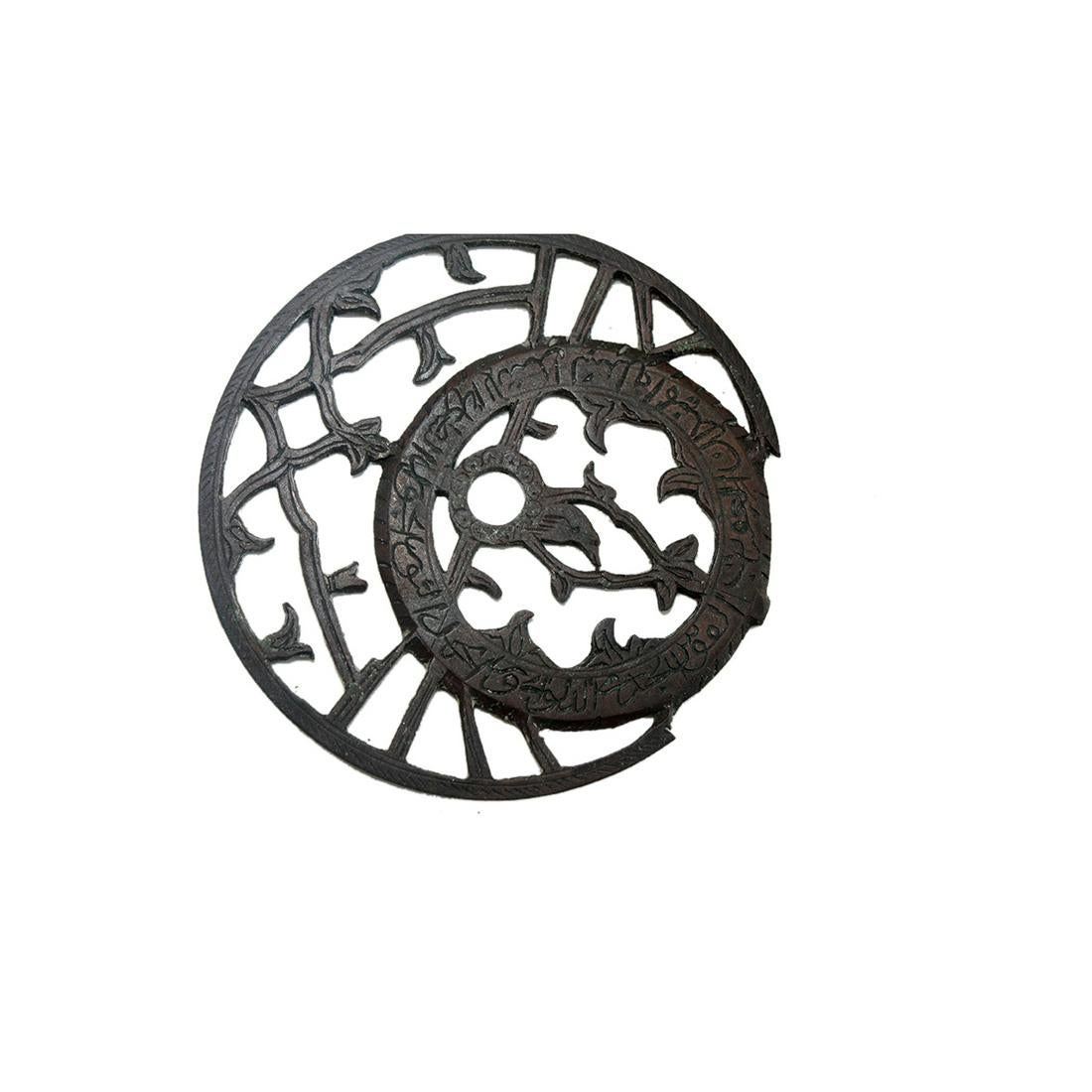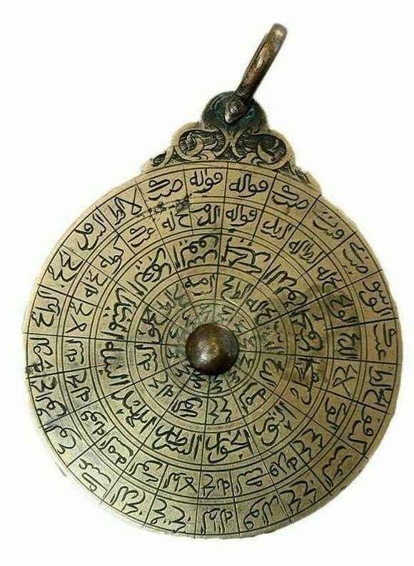 Middle Eastern Islamic Copper Astrolabe. Size 3 1/4 inches length x 2 1/4 inches diameter. A small copper Astrolabe with four disks, decorated with horoscope signs and Arabic calligraphy.