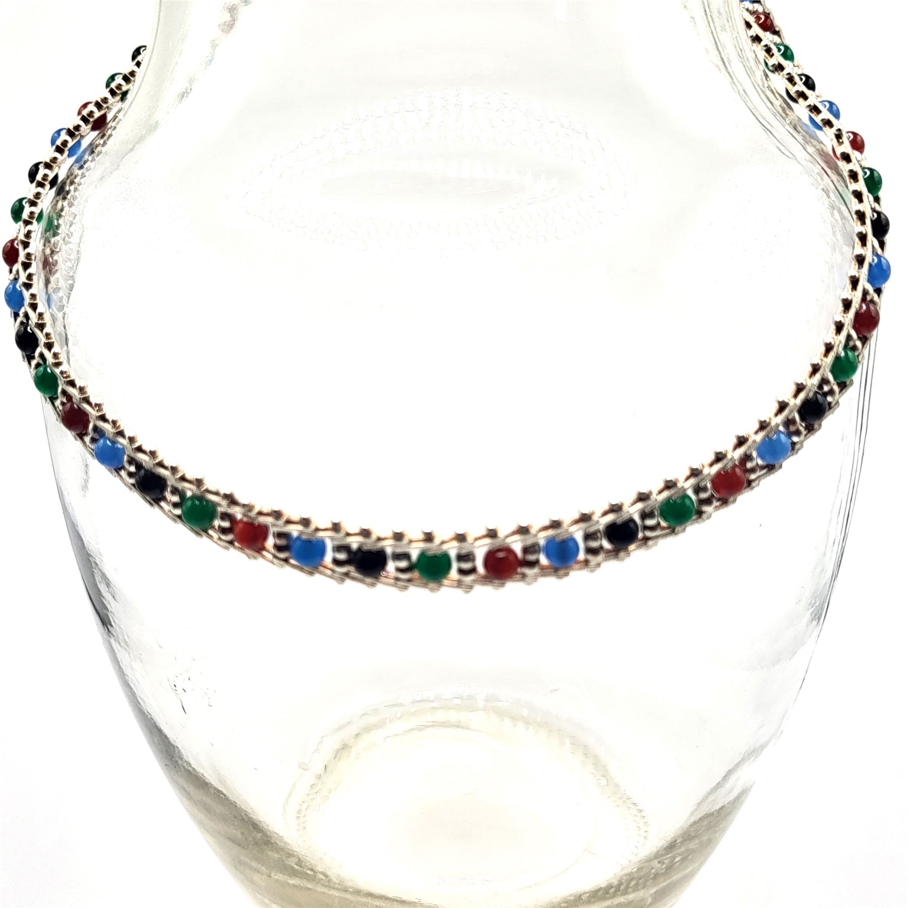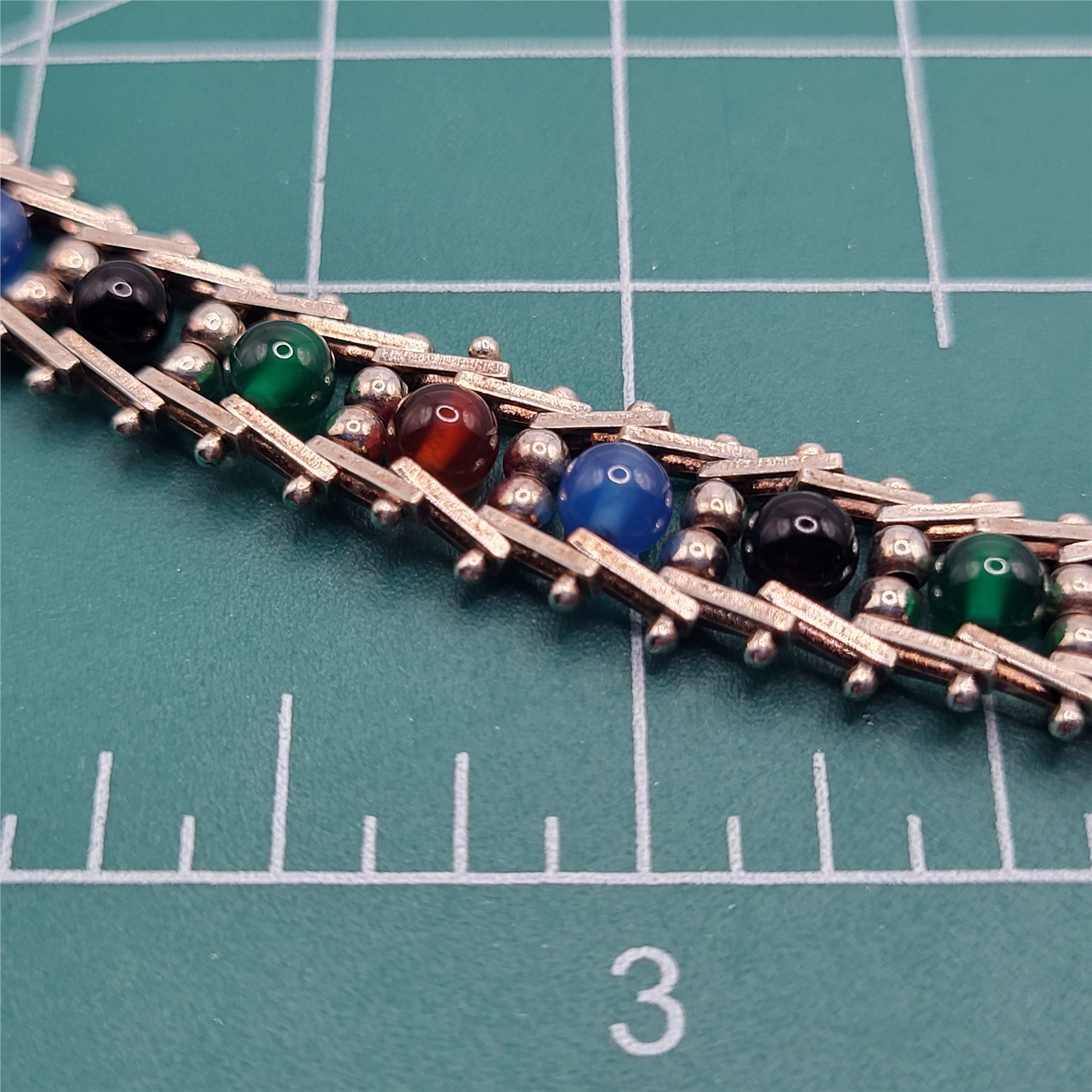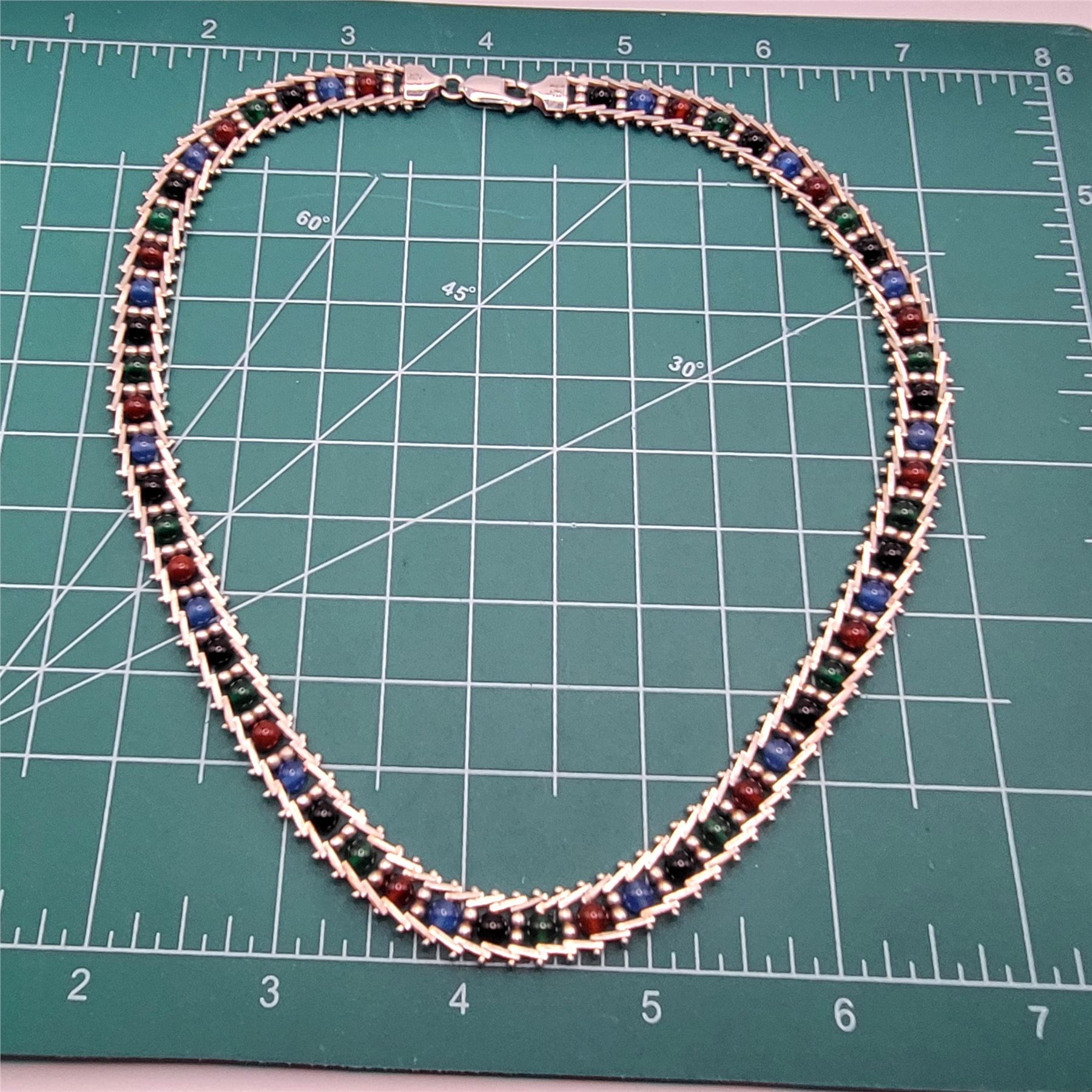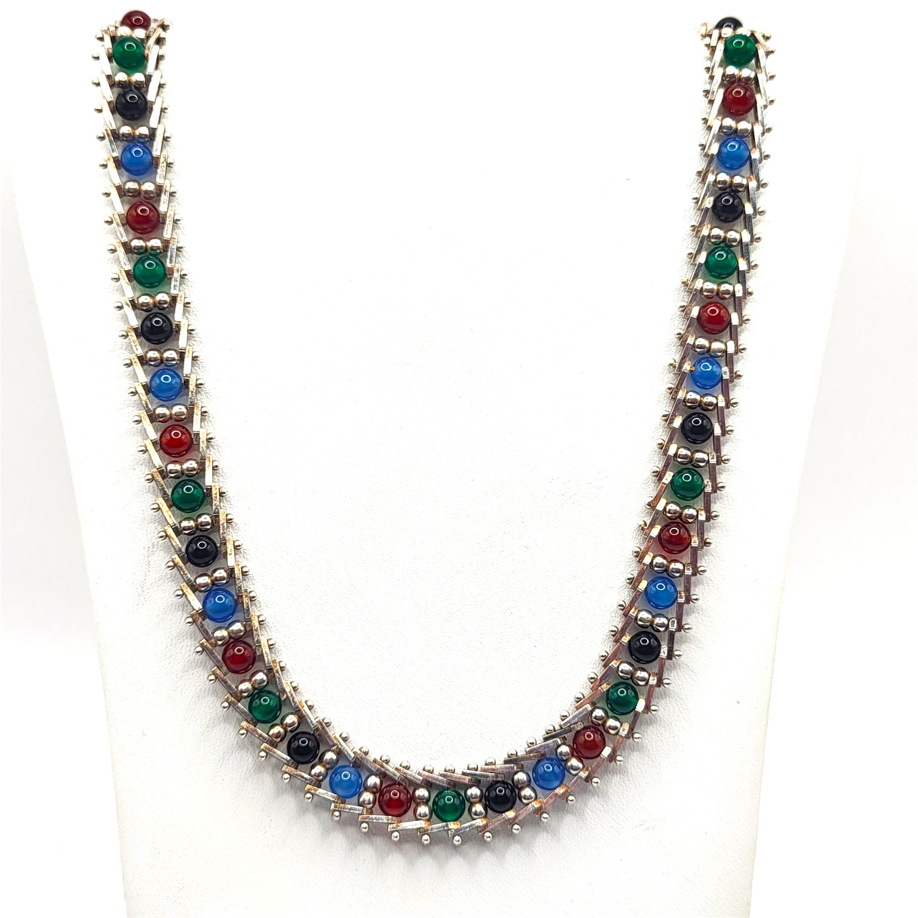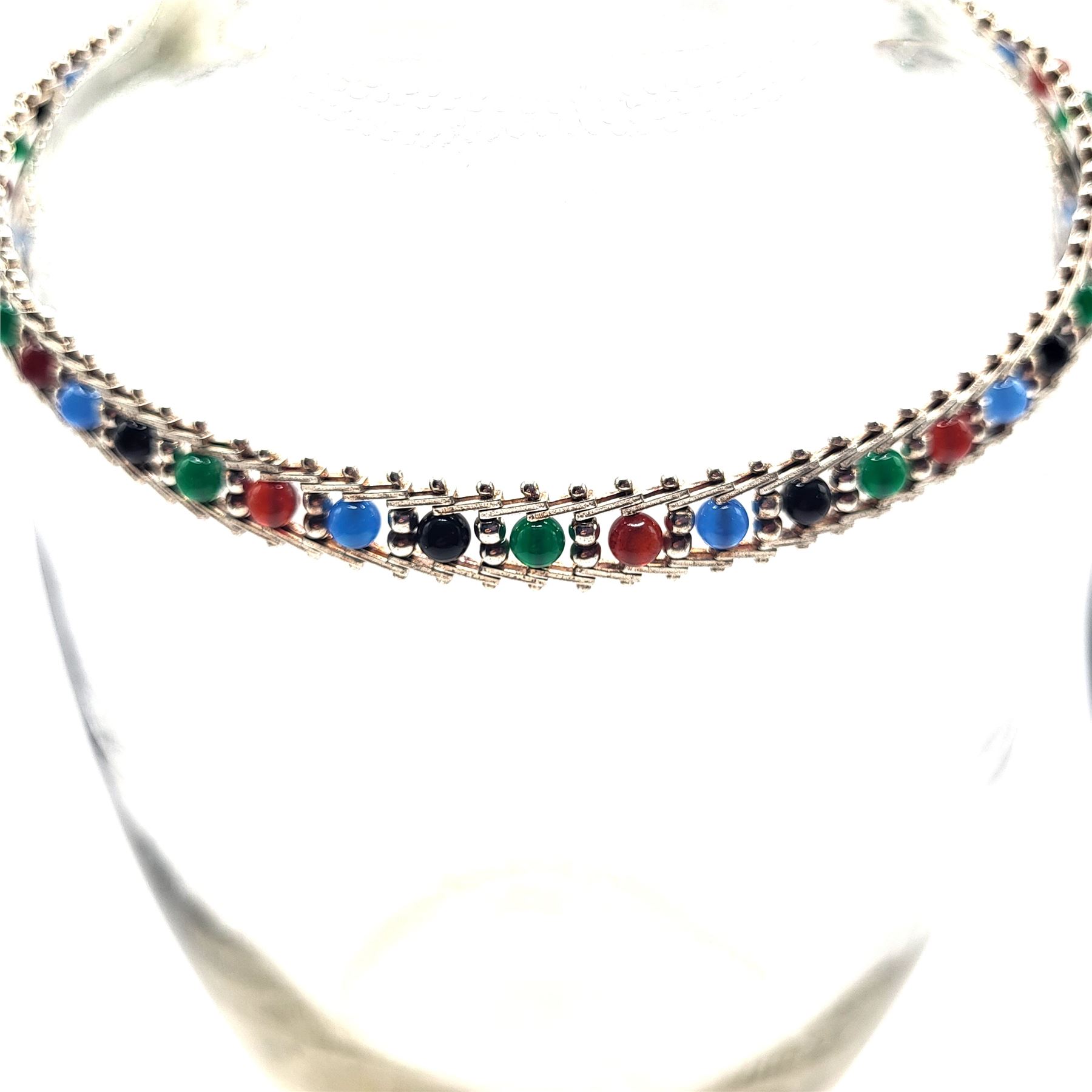 This sterling silver necklace displays an array of color in onyx: black, red, green, and blue. The onyx beads are approximately 4.25mm and the center of each riveted link, separated by 2.5mm beads.& nbsp; The necklace is approximately 17& quot; long and 9.75mm wide, with a lobster clasp. The Milor hallmark is on one of the end caps.& nbsp; Admin: 33120/24lr