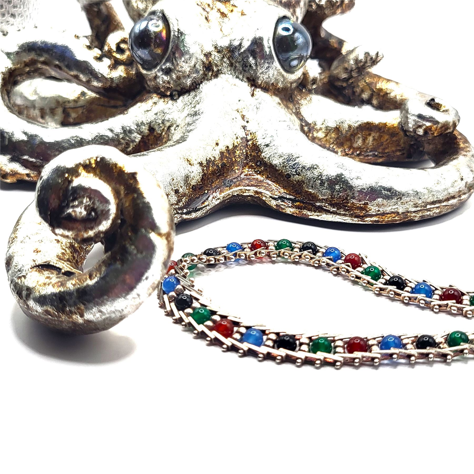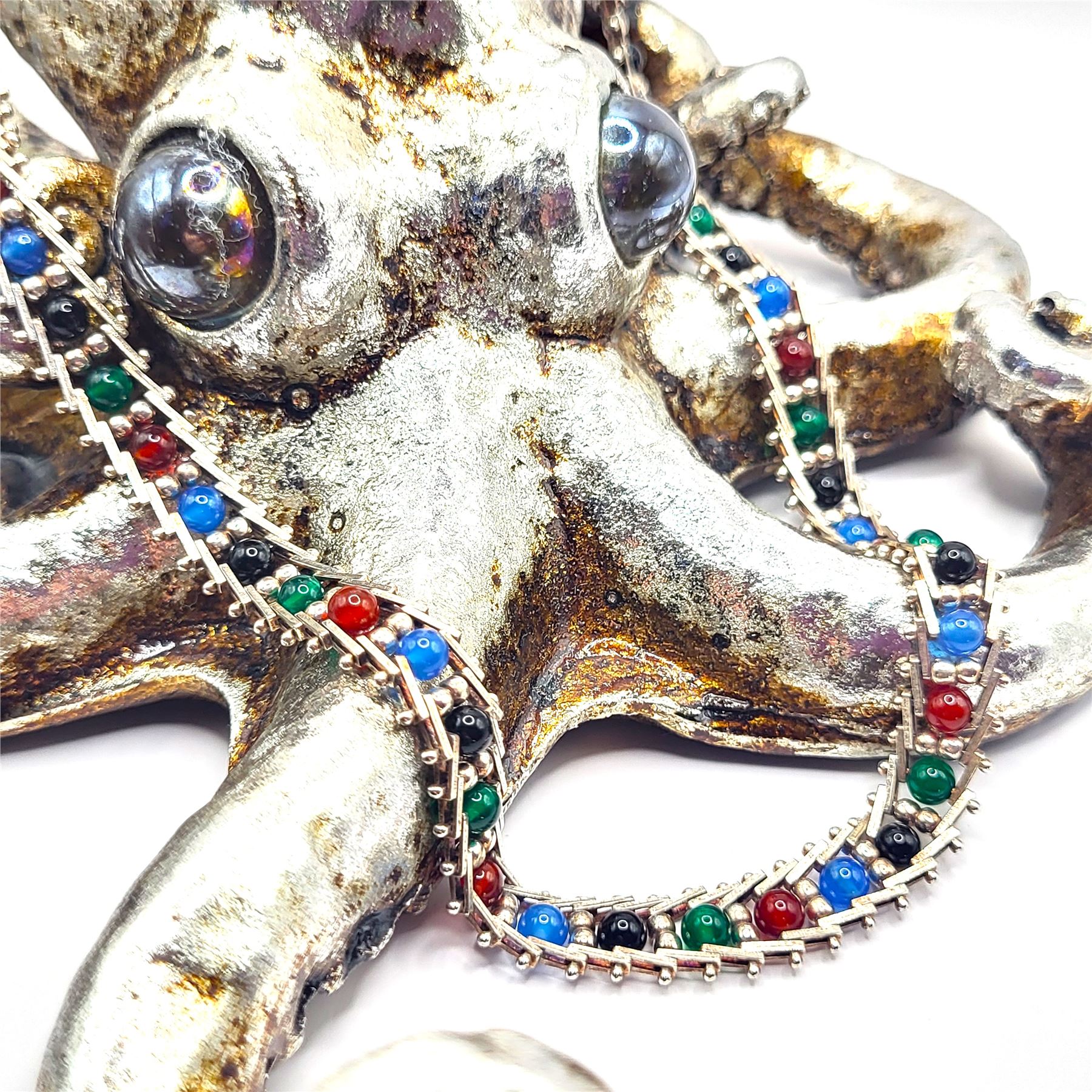 Main Gemstone: Onyx, Multiple Colors: Orange (Carnelian), Blue, Green, and Black.