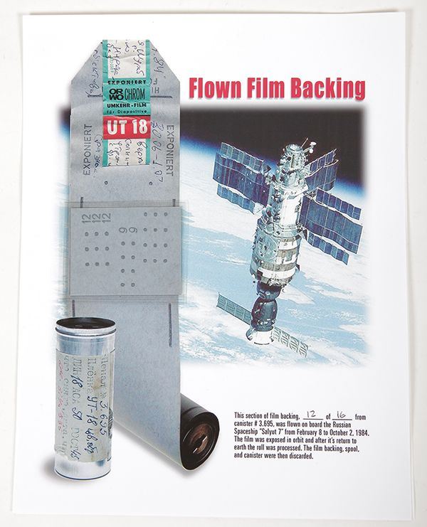 Mir Flown Film Backing. Mir was launched on 2/20/86 and was manned for twelve and a half years. The station was launched from pad LC-200/39, and LC-81/23, Baikonur Cosmodrome. As many may recall older film cameras used a paper film backing to help feed the film into the camera. This is a segment of film backing that was used aboard Mir by the Expedition 5 crew.