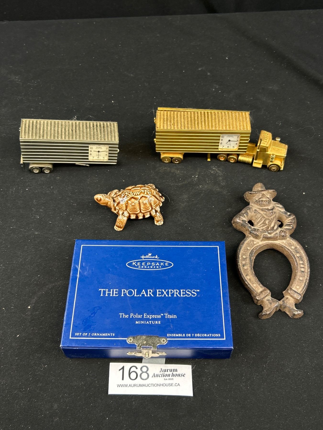 Misc Collectible Lot of Truck Desk Clocks + Polar Express Brass Cowboy, etc