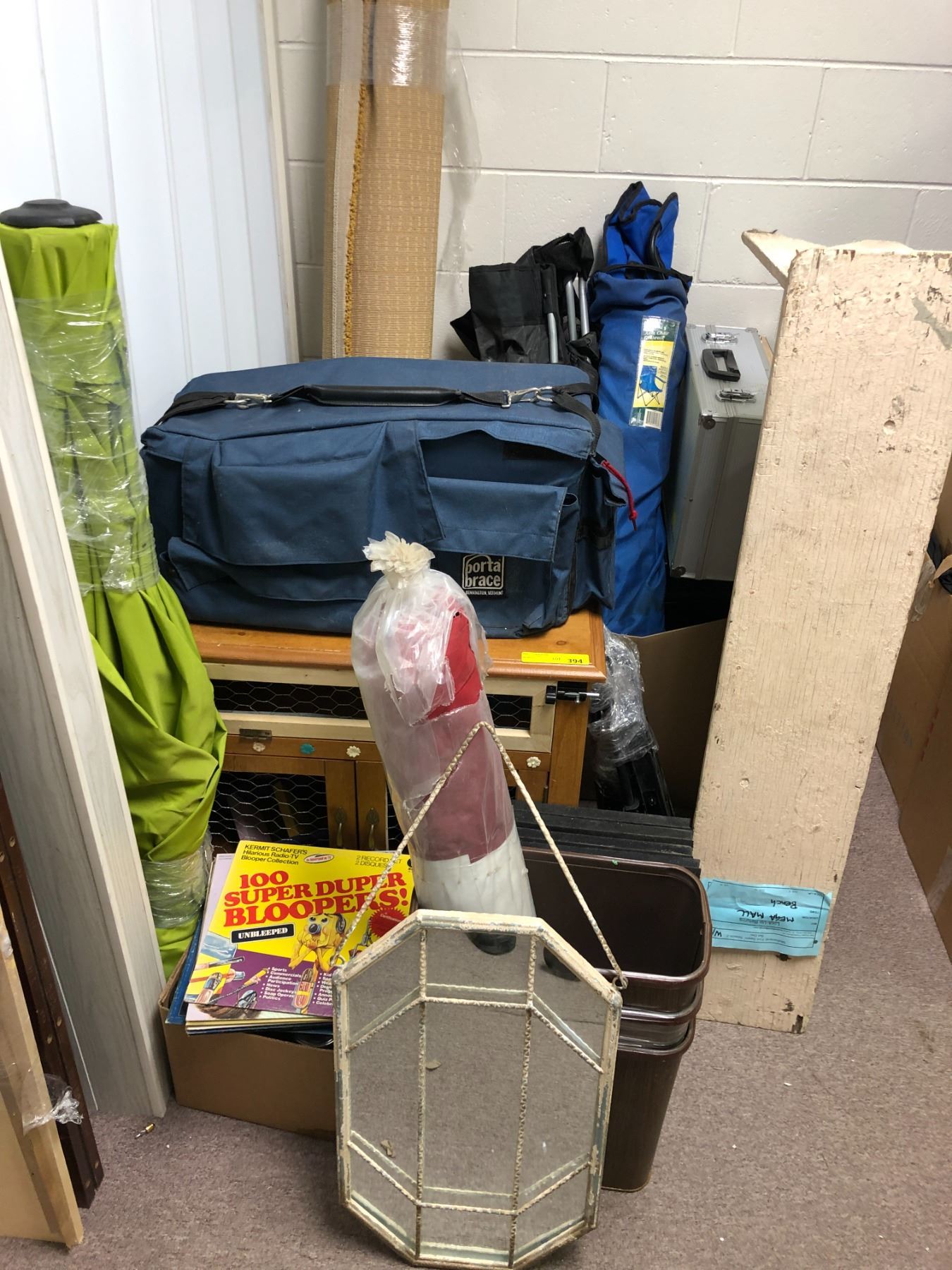 Misc. Lot of Rabbit Cage, Arm Chairs, Bench, Bulleting Boards, Metal Suitcase & Umbrella Stand
