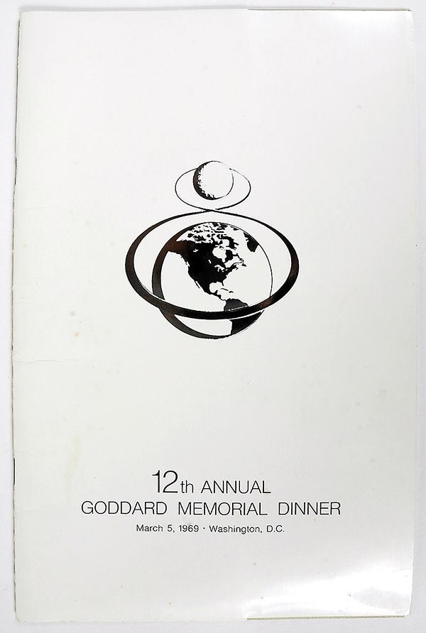 Miscellaneous, 1969, "12th Annual Goddard Memorial Dinner" Program (7x11") The front page of this program reads: "To Mitch" and is signed by Barry Goldwater and Thomas J. Heyden, Jr. The program lists the consignor as being awarded the Robert H. Goddard Historical Essay Award at the dinner, presented by Dr. Wernher von Braun, for his essay "Development of the Lifesaving Rocket". An important award that has not been publicized all that much. Unusual and interesting. Ex. the Mitchell Sharpe Estate collection.