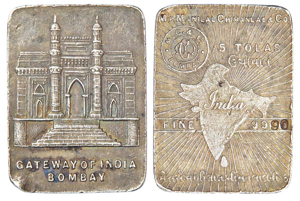 Silver bar, 5 tola, 58.2g, 0.9990 fine silver, issued by M/s. Manilal Chimanlal & Co. Bombay.