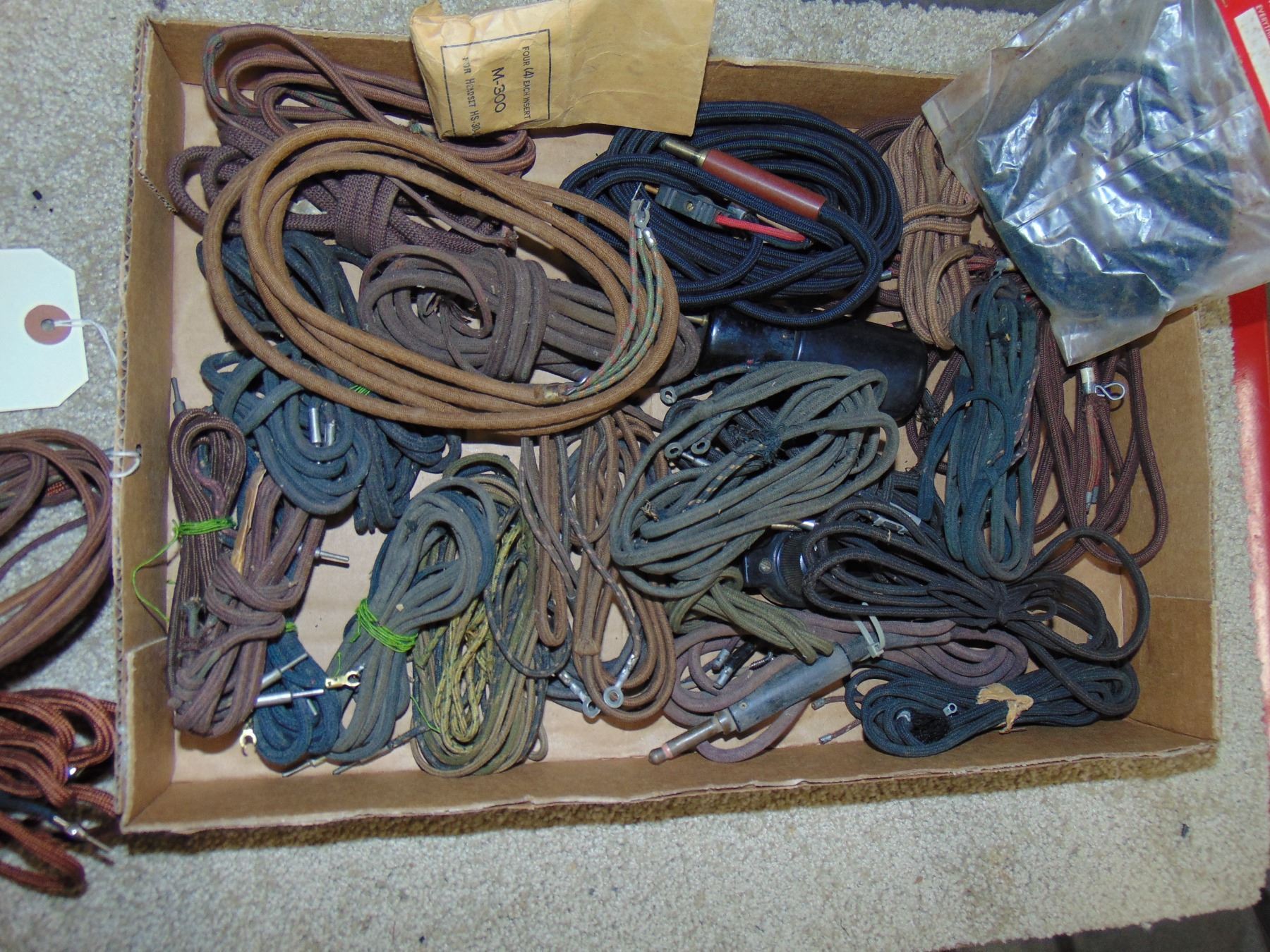 Flat of new and good usable headphones and cloth-covered speaker phone cords; vintage