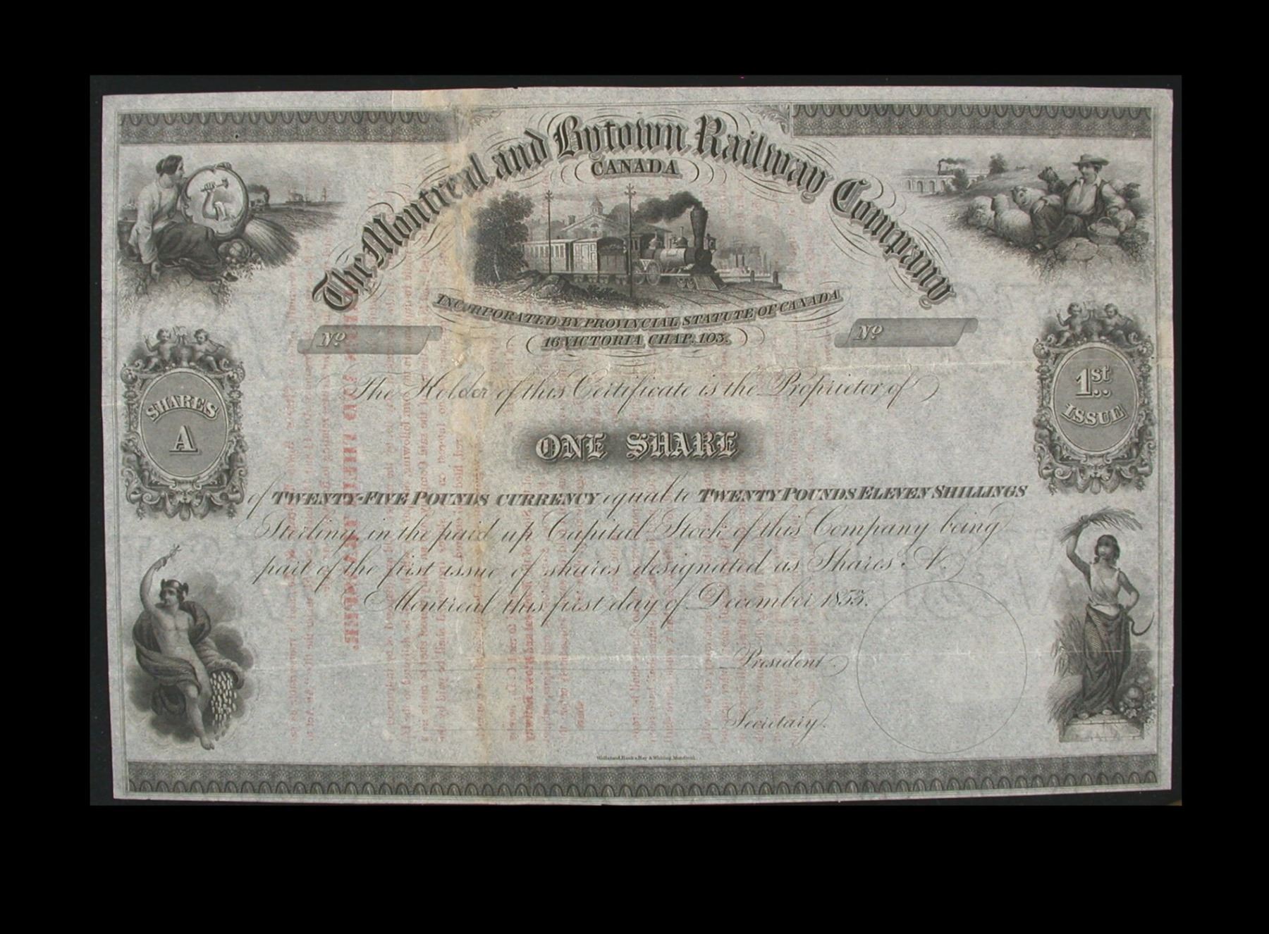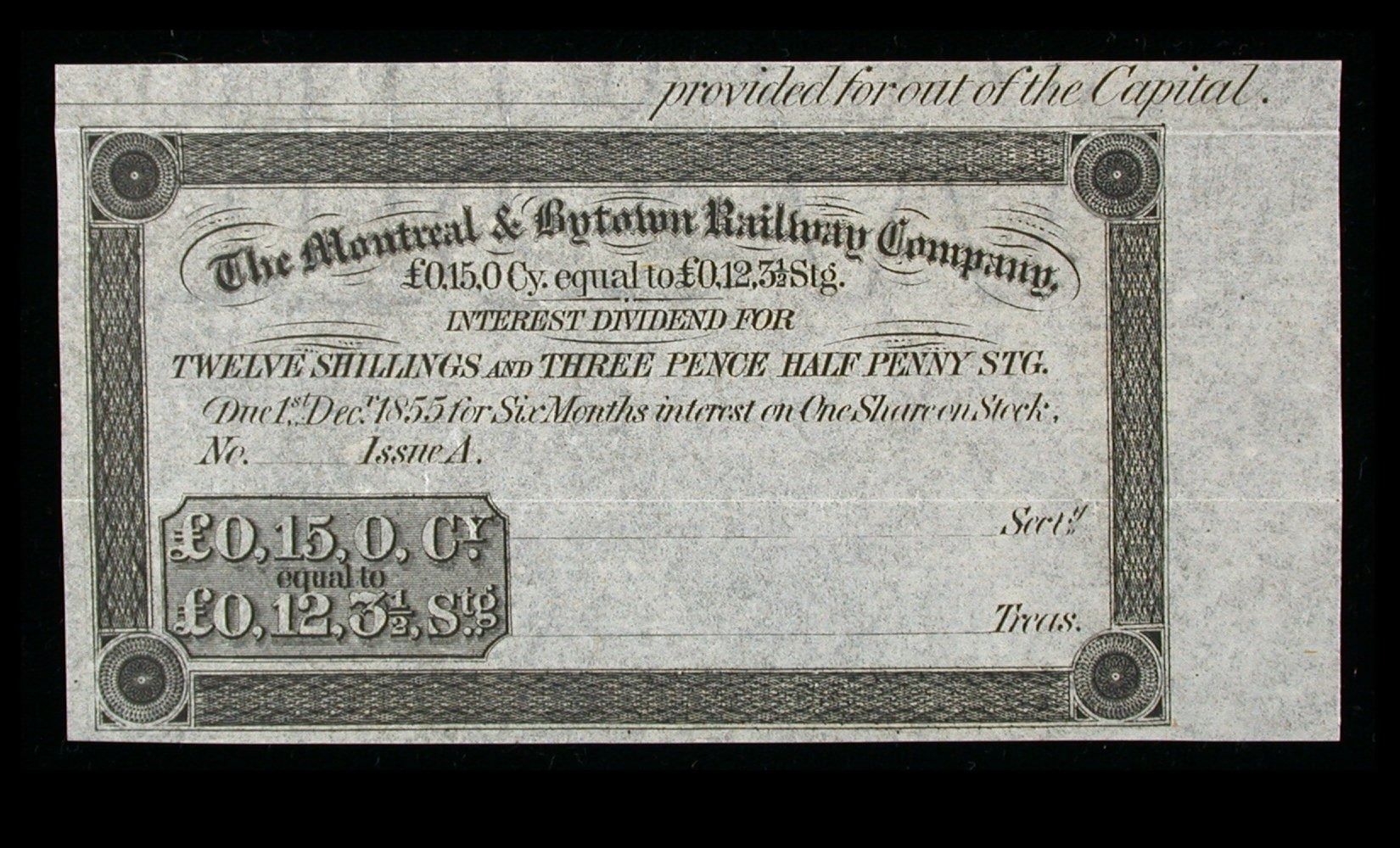 An original 1st Issue £25 Share Certificate of The Montreal and Bytown Railway Company, dated 1853, measuring 30x20cm with a single separate 10x5.5cm interest certificate of "Twelve Shillings and Three Pence Half Penny". Fragile with repairs - a scarce certificate, very few known and all with damage and repairs.