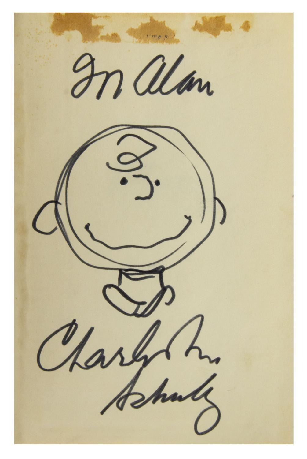 (Rinehart, 1954/1980) A hardcover 1954 edition of More Peanuts hand-signed with an illustration of Charlie Brown by creator Charles Schulz. The top of the illustration reads "for Alan" with a large drawing of Charlie Brown in felt pen and a bold signature by Schulz. Measuring 5.5" x 8.25", the book is in fair condition with wear throughout from use, cracking at the spine, inscriptions on the inside back cover, and some adhesive residue near the top of the page above Schulz's drawing.