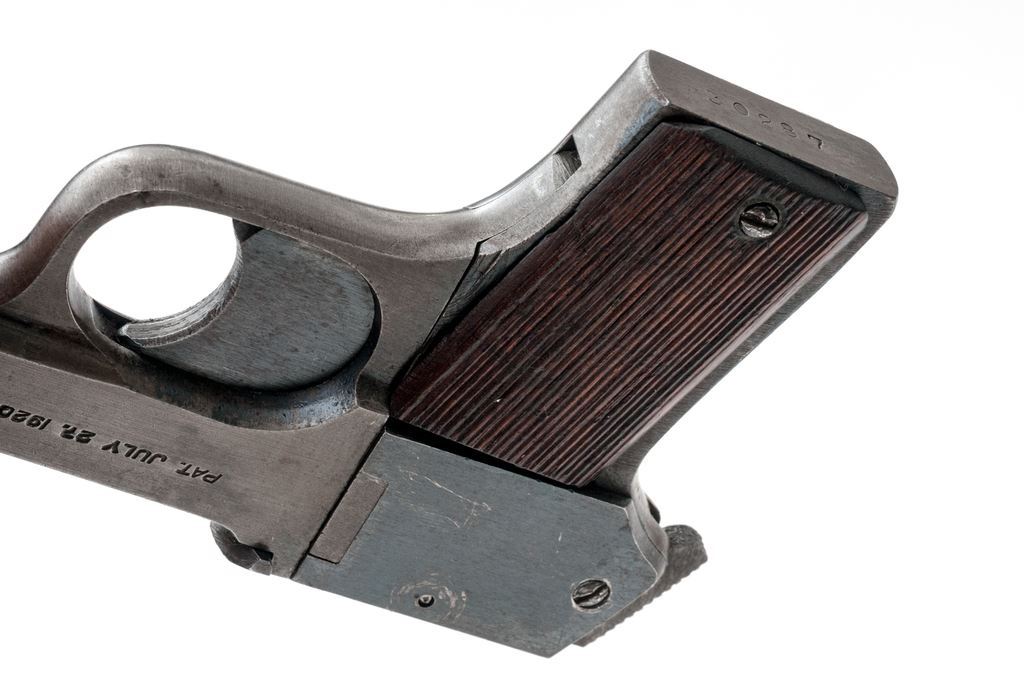 Mossberg Brownie 4-Shot Derringer, #30287, .22 LR cal., 2.5" barrels, blue finish, serrated walnut grips, standard fixed sights. Removable shell extractor is present and is concealed in left side of frame but is thinner and likely a replacement. Mfg'd ca. 1919-1932. Condition is good. Metal surfaces retain approx. 35%-40% thinning and toning blue, with scattered patches of light frosting, scratches and other handling wear. Factory lettering is clear. Grips show signs of age and handling wear, left grip with horizontal scratches and impressions. Latch is a little loose, otherwise the action is good, barrels remain tight to the frame, trigger pull is smooth; Bores are clean, each with a patch or two of light frosting, rifling is clearly defined. Est.: $200-$300. (C&R/PPT)