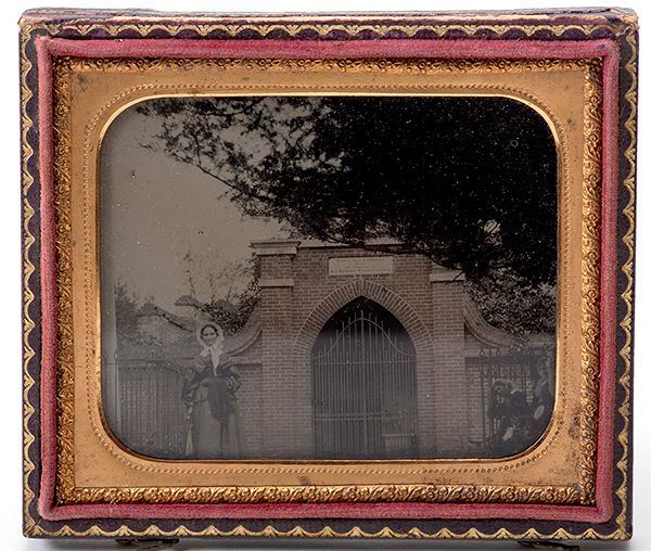 [mount Vernon Ladies' Association] Ambrotype of Ann Pamela Cunningham. Sixth plate ambrotype of the woman who founded the Mount Vernon Ladies' Association and served as its first regent, and who oversaw the purchase and restoration of Mount Vernon. Cunningham (1816-1875) is pictured to the left of Washington's tomb; three other women are visible at the right margin. Fine condition. The ambrotype is housed in a period case with floral and bird designs. The hinge of the case is broken; both clasps are present.