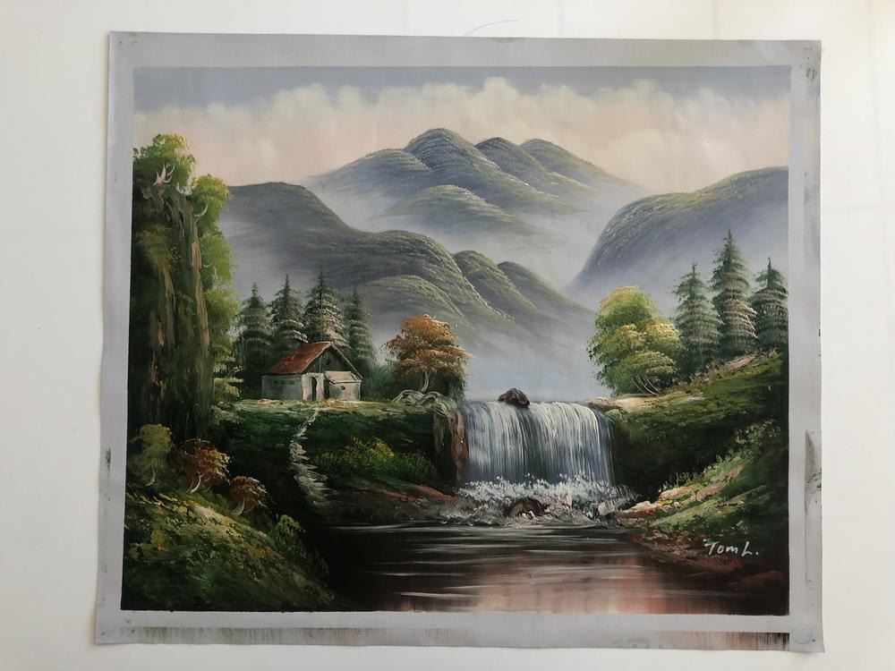 Mountain Cabin - Waterfall - Landscape Art. 23x27 inches