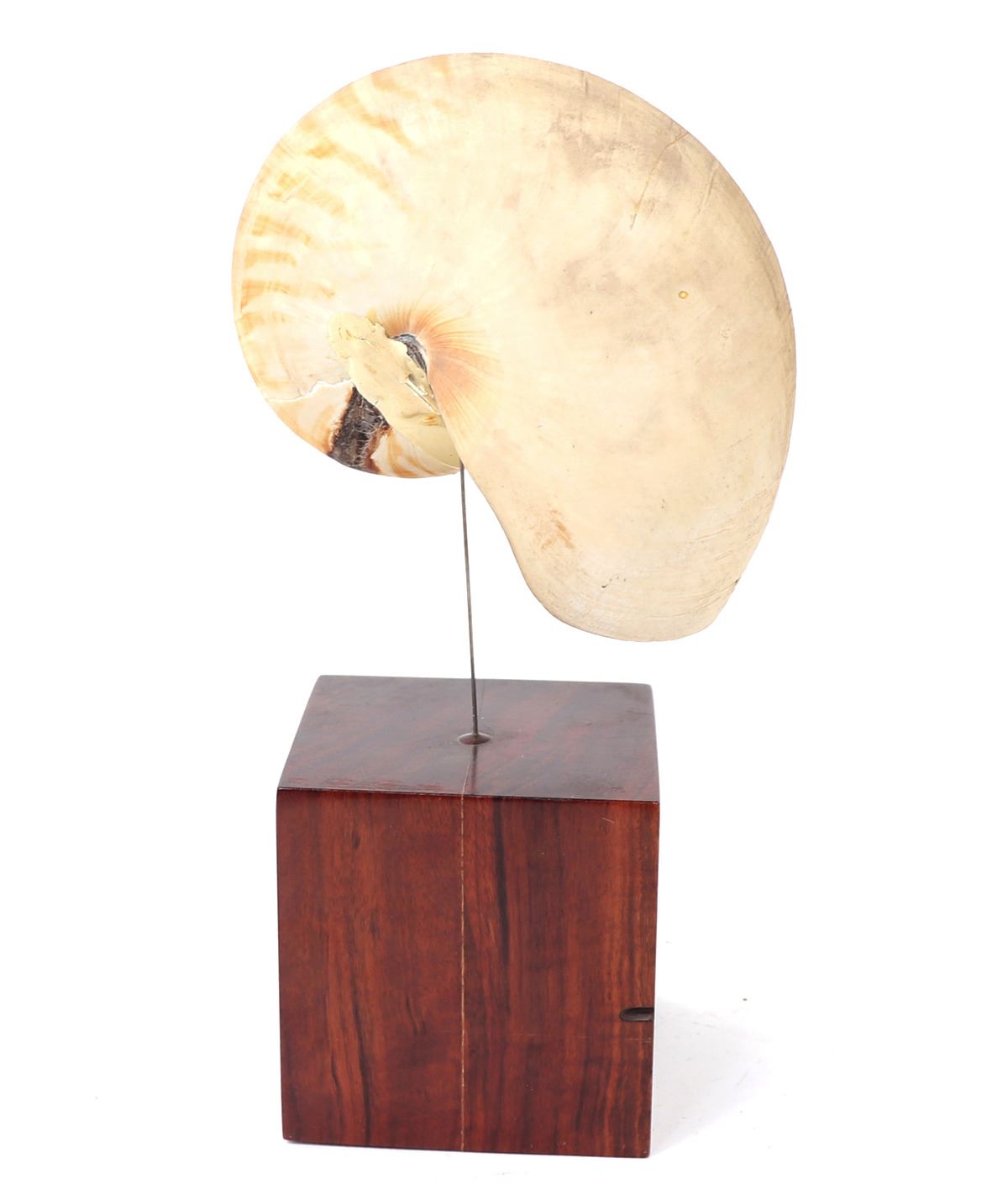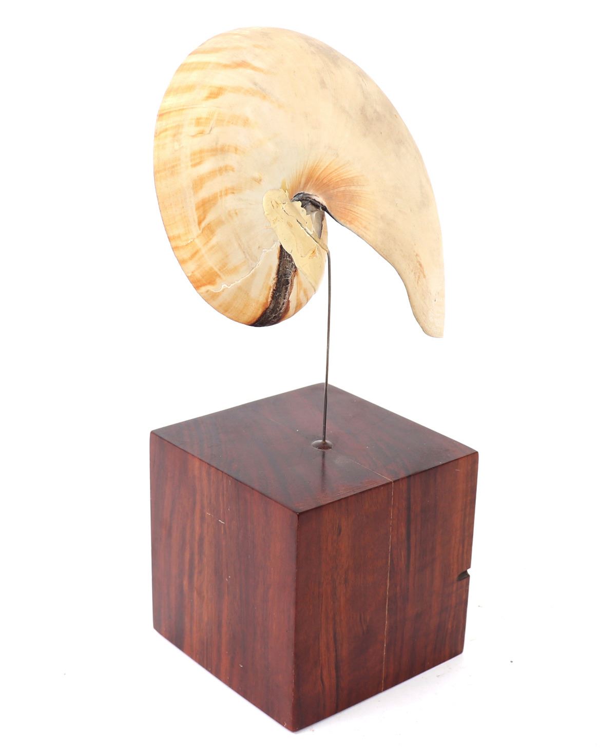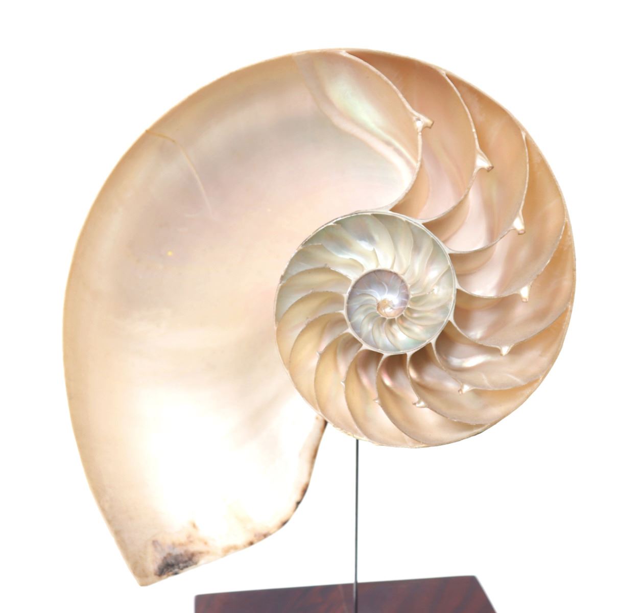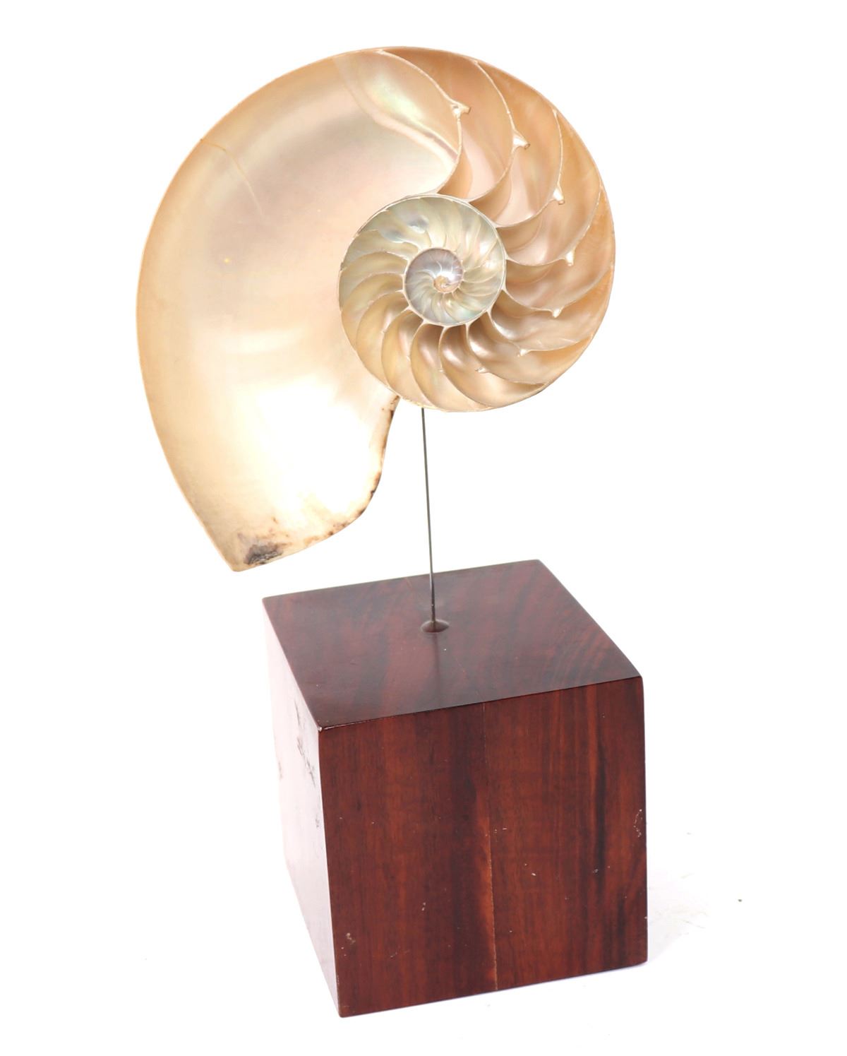 Gorgeous half shell of a nautilus snail wonderfully presented on a maple block stand. Unmistakable iridescence throughout. Size 10 1/2" H on custom stand. Condition: Well preserved condition throughout.