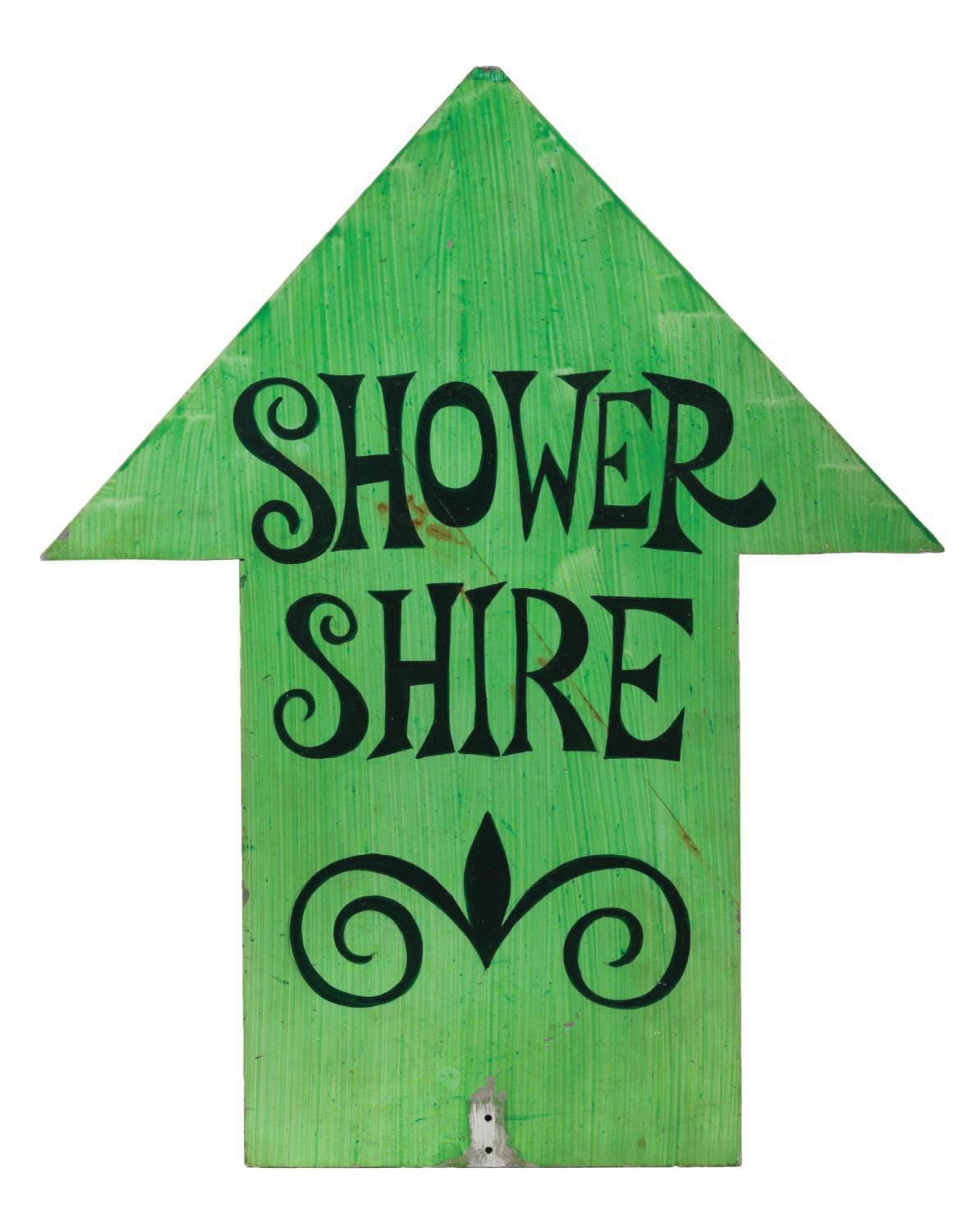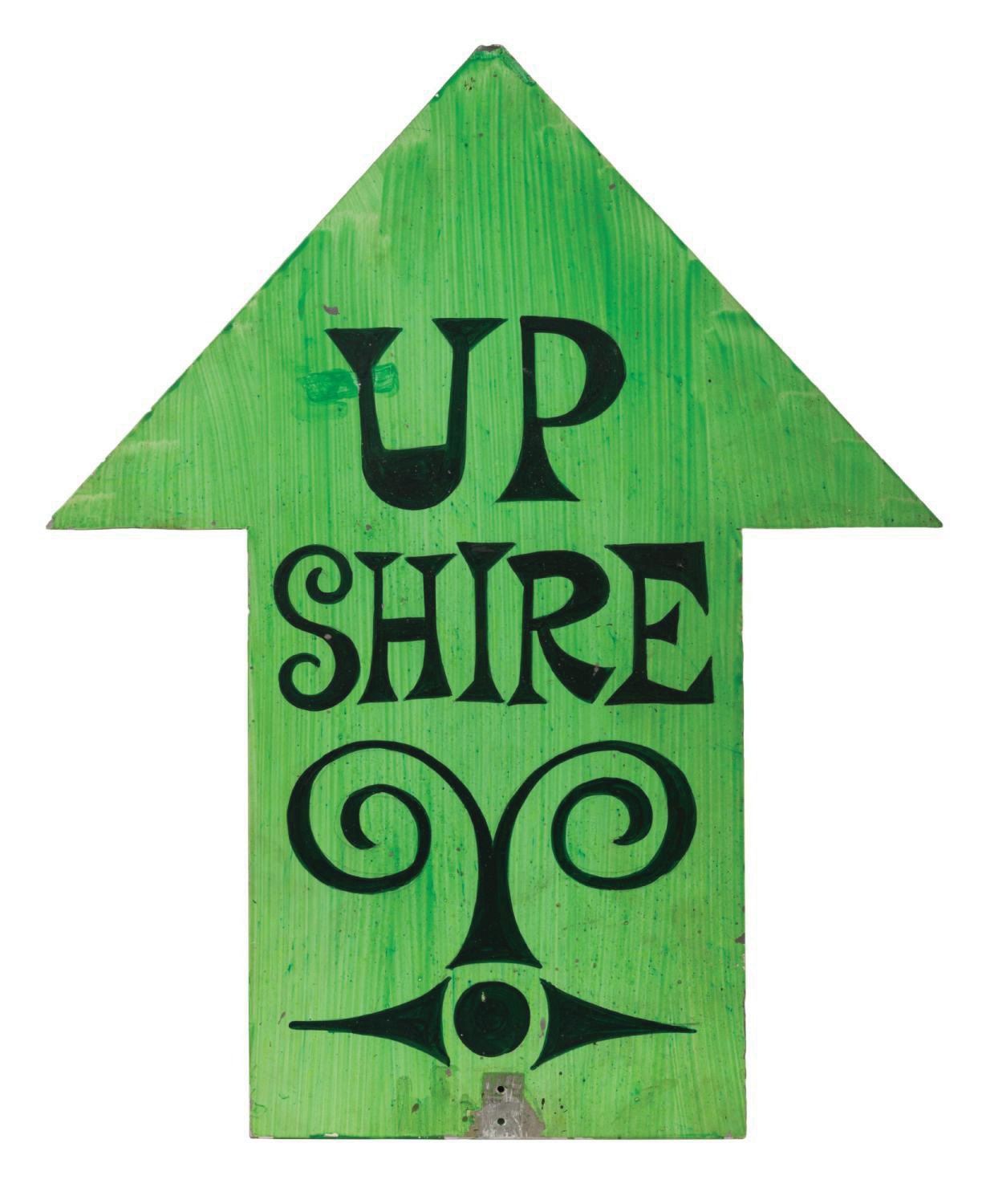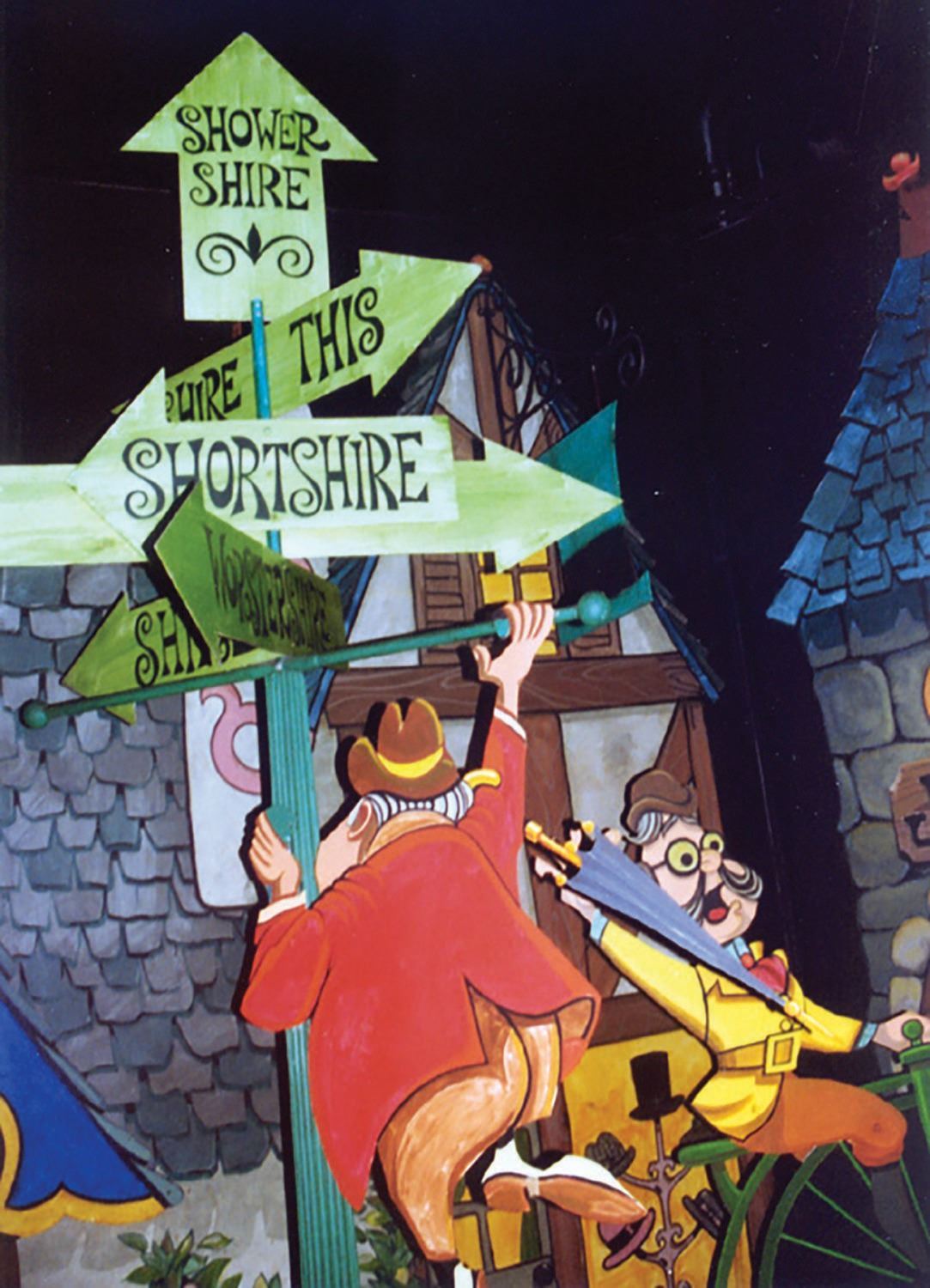 (Walt Disney World, c.1971-80s) An original metal sign prop from Mr. Toad's Wild Ride. Serving as one of the opening day attractions at Walt Disney World's Magic Kingdom, this beloved attraction was removed from the Park in 1998. The beautifully hand-painted sign is double-sided, as it was located atop a rotating directional signpost in the highly memorable Town Square area of the attraction. The item measures 26.75"x22" and is in good condition with visible rust on one side from age and some surface and edge wear overall from its use and removal, including a few small chips and scuffs to the paint.