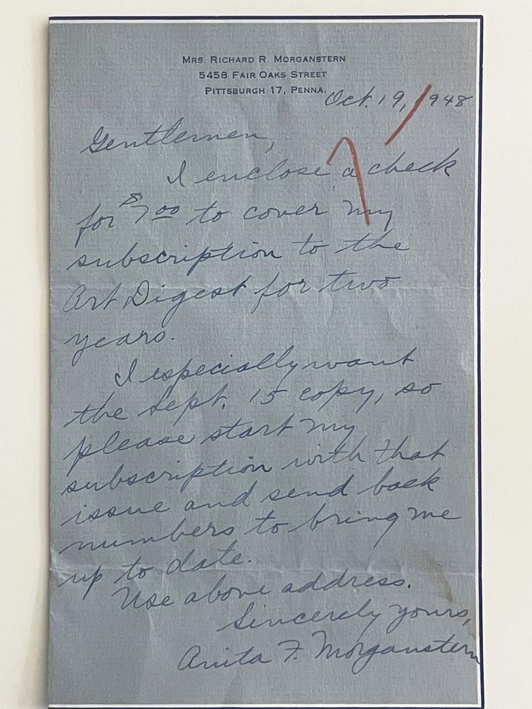 Anita Morganstern signed letter. October 19th, 1948. 5x8 inches