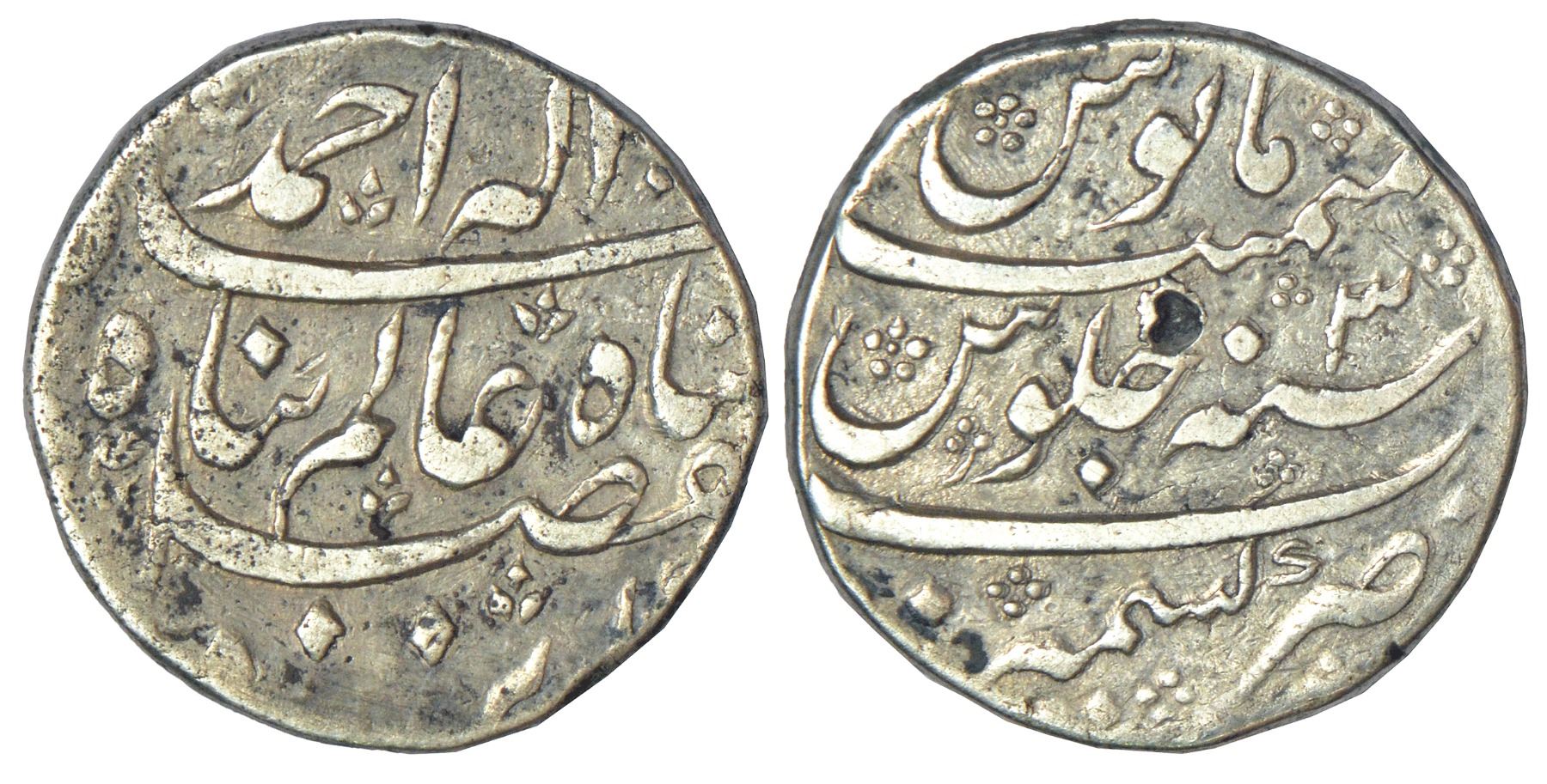 Ahmad Shah Bahadur (1748-1754 AD), silver rupee, Kashmir mint, 'Alam Panah' couplet, RY 3, KM 447.1, 11.07g.