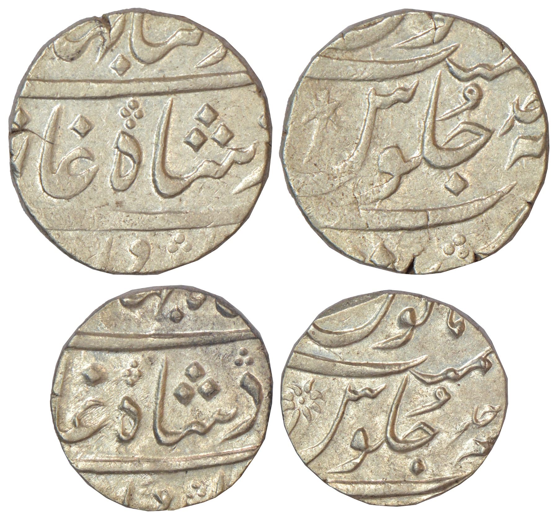 Ahmad Shah Bahadur (1748-1754 AD), silver rupee & ½ rupee, Surat mint, RY Ahd, KM 446.36 & 444.3, ½ rupee mint off flan, 11.53g & 5.75g. (2 coins)