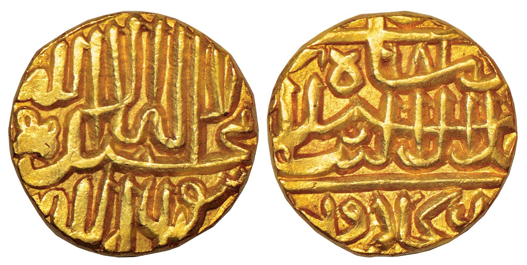 Akbar (1556-1605 AD), gold mohur, 10.99g, Dar ul-Khilafat Agra mint, AH 981, kalima on obverse and title of Akbar in oblong square on reverse, KM 106.1.