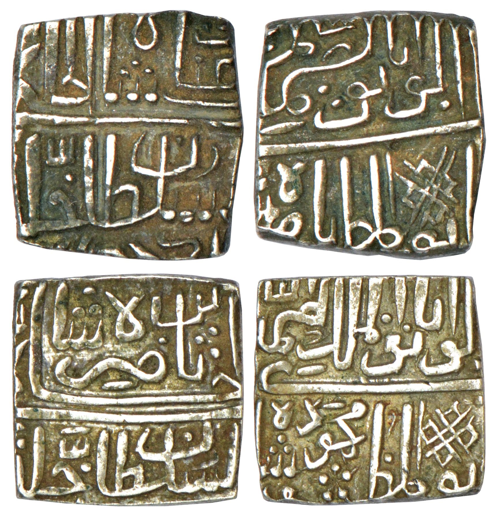 Sultans of Malwa - Silver square ½ tanka (2). (A) Nasir Shah (1500-1510 AD), al-wathiq type, G&G M110, 5.40g. (B) Mahmud Shah II (1510-1531 AD), abu'l Muzaffar type, G&G M150, 5.44g. (2 coins)