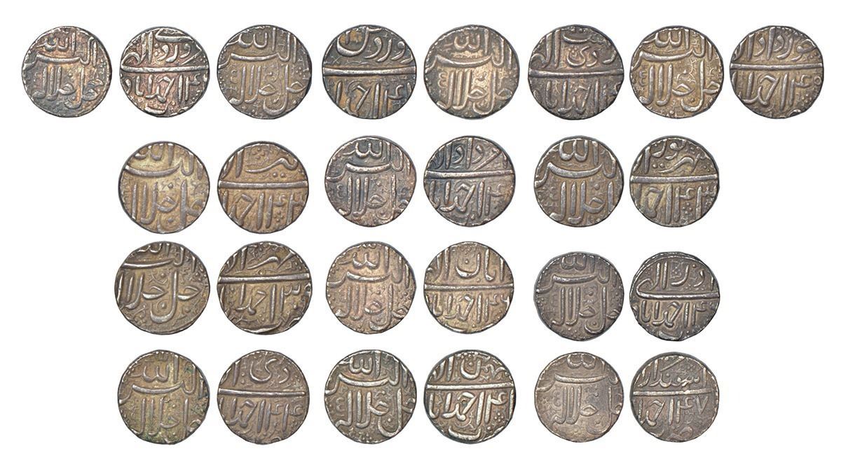 Mughals: Akbar (1556-1605 AD), silver rupee (13), complete set of 12 different months, Ahmadabad mint, with 2 coins of Farwardin month having variation i.e. Farwardi and Farwardin, KM 93.2. Farwardi-4x; Farwardin-4x; Ardibihist-4x; Khurdad-45; Tir-43; Amardad-4x; Shahrewar-43; Mihr-39; Aban-46; Azar-46; Di-44; Bahman-41 and Isfandarmunz-47. (13 coins)