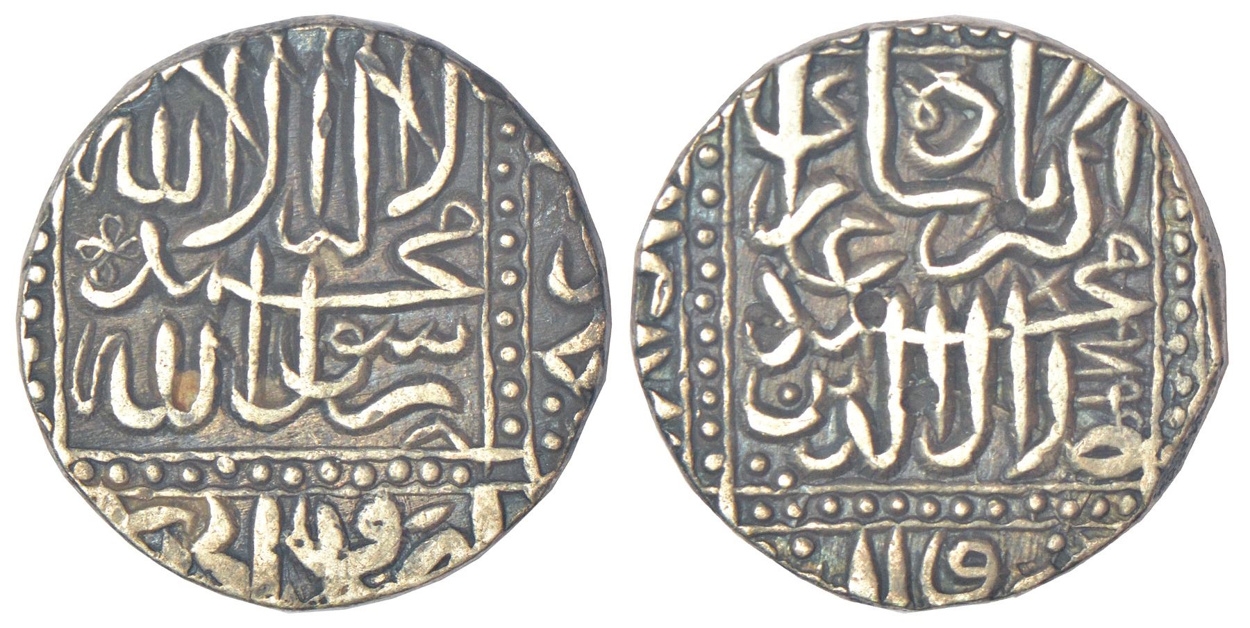 Akbar (1556-1605 AD), silver rupee, Anhirwala Pattan mint, AH 984, KM 80.4, 11.34g. Obv: Kalima within dotted square. Rev: Inscription Jalal ud-Din Muhammad Akbar Badshah Ghazi and date within dotted square & mint-name at bottom.