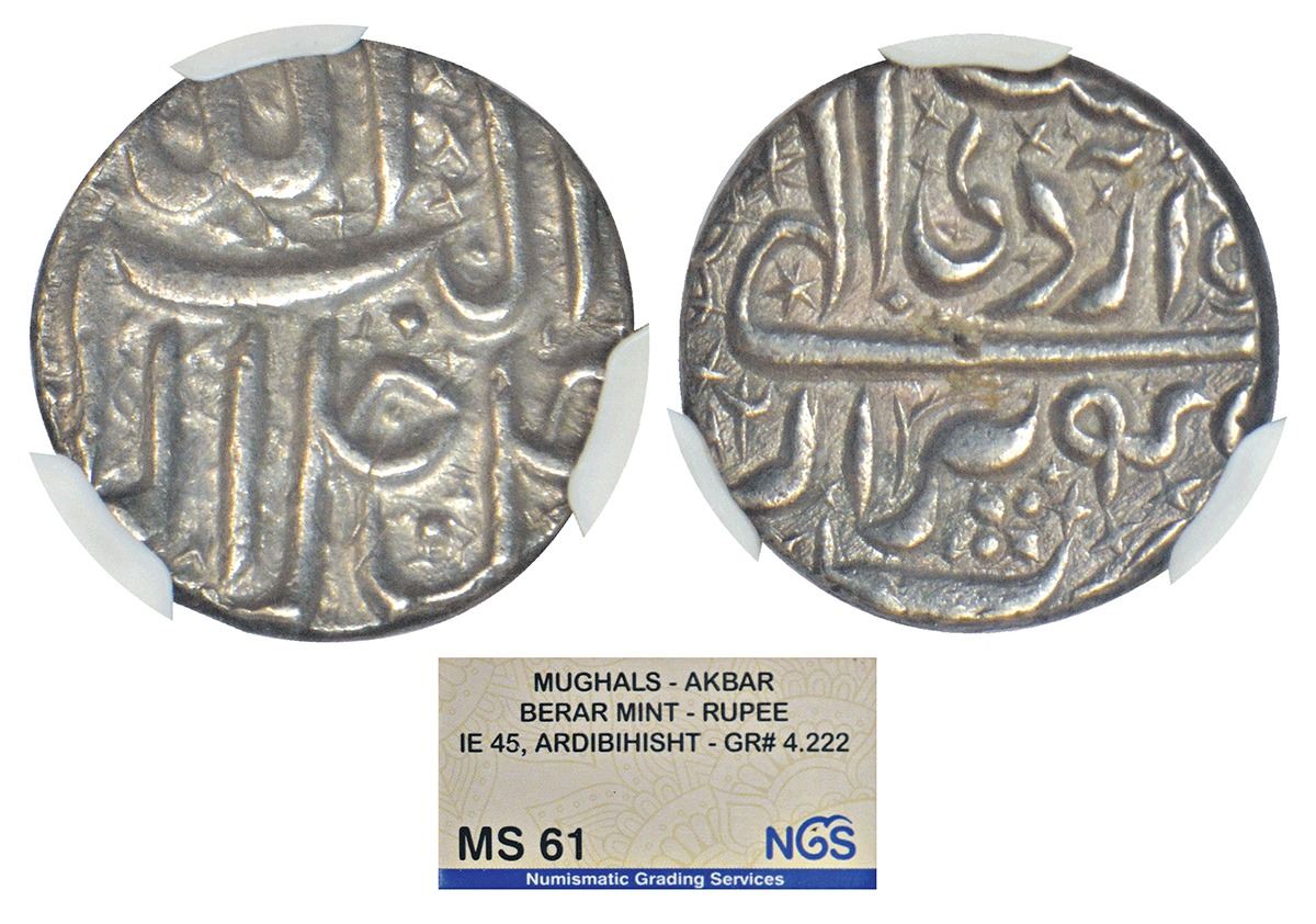 Mughals: Akbar (1556-1605 AD), silver rupee, Berar mint, Ardibihisht, Ilahi 45, KM 93.6.