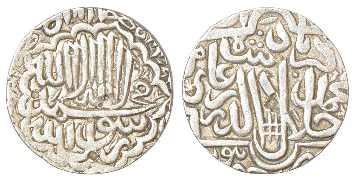 Akbar (1556-1605 AD), silver rupee, Dar ul-Khilafat Jaunpur mint, no date type, Kalima within cinquefoil border on obverse with names and title of four caliphs in margin, star and crisscross symbol on reverse, Liddle Akbar S9, 11.38g.