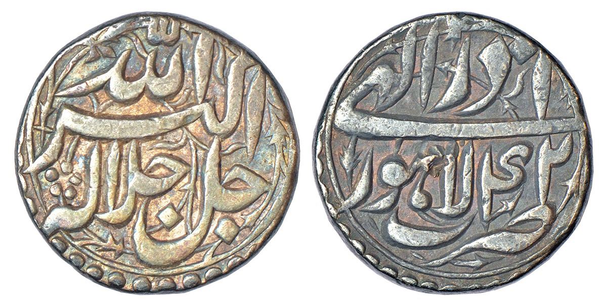 Akbar (1556-1605 AD), silver rupee, Lahore mint, Azar, Ilahi 42, KM 93.11, 11.28g. Obv: Persian legend Jalla Jalalahu Allahu Akbar. Rev: Mint-name, Ilahi month and year; decorative floral fields on both sides.
