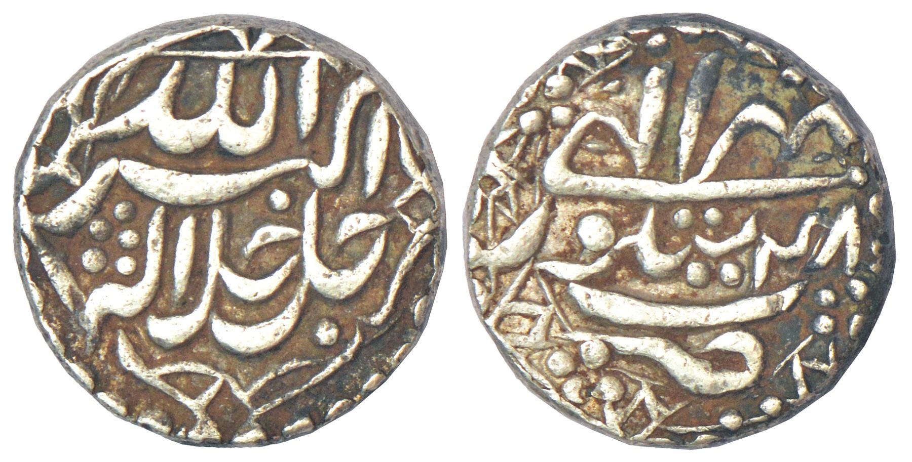 Akbar (1556-1605 AD), silver rupee, Sitpur mint, Mihr 48, KM 94.4, 11.35g. Obv: Jal Jalal Allahu Akbar in quarter foil border. Rev: Mint name, month and Ilahi year in octagonal border.