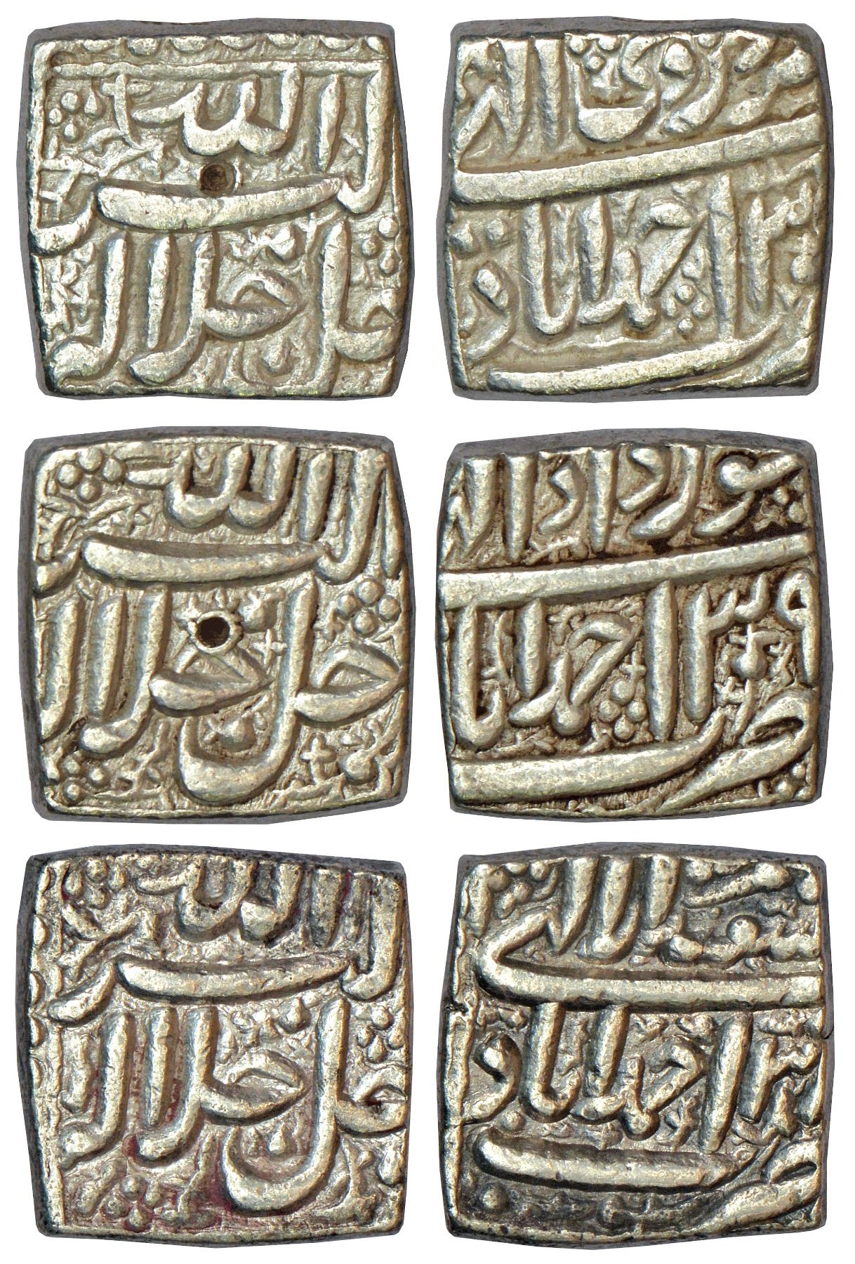 Akbar (1556-1605 AD), silver square rupee (3), Ahmadabad mint, 1x Farwardin 3x, 11.41g; 1x Khurdad 39, 11.40g and 1x Isfandarmunz 3x, 11.44g, KM 88.1. (3 different months)