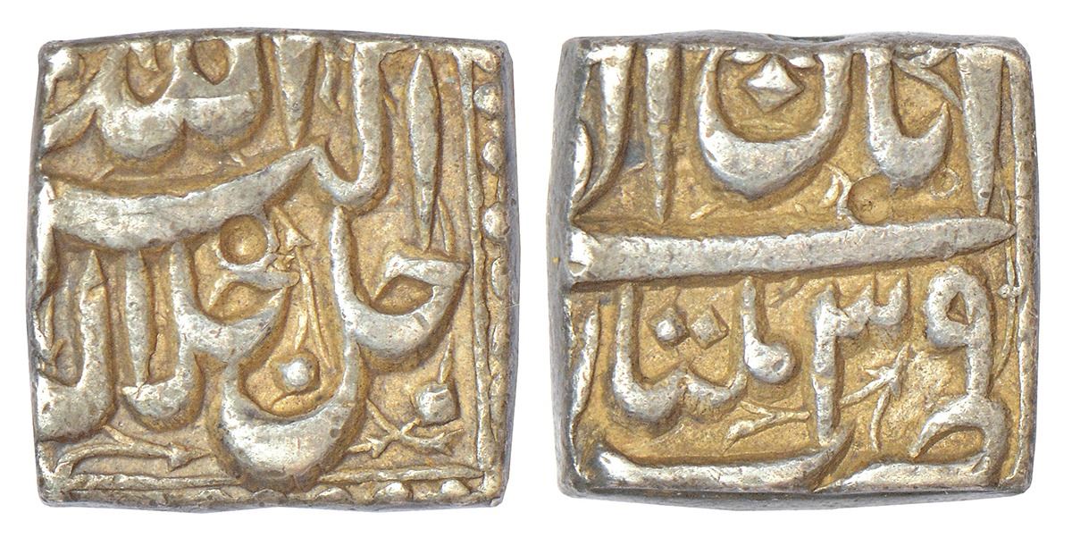 Mughals: Akbar (1556-1605 AD) silver square rupee, Multan mint, Aban, Ilahi 39, KM 88.4, Liddle Akbar type S-48, 11.36g. Obv: Persian Legend Jal Jalalhu Akbar Allah. Rev: Persian legend Zarb Multan Aban Ilahi 39.