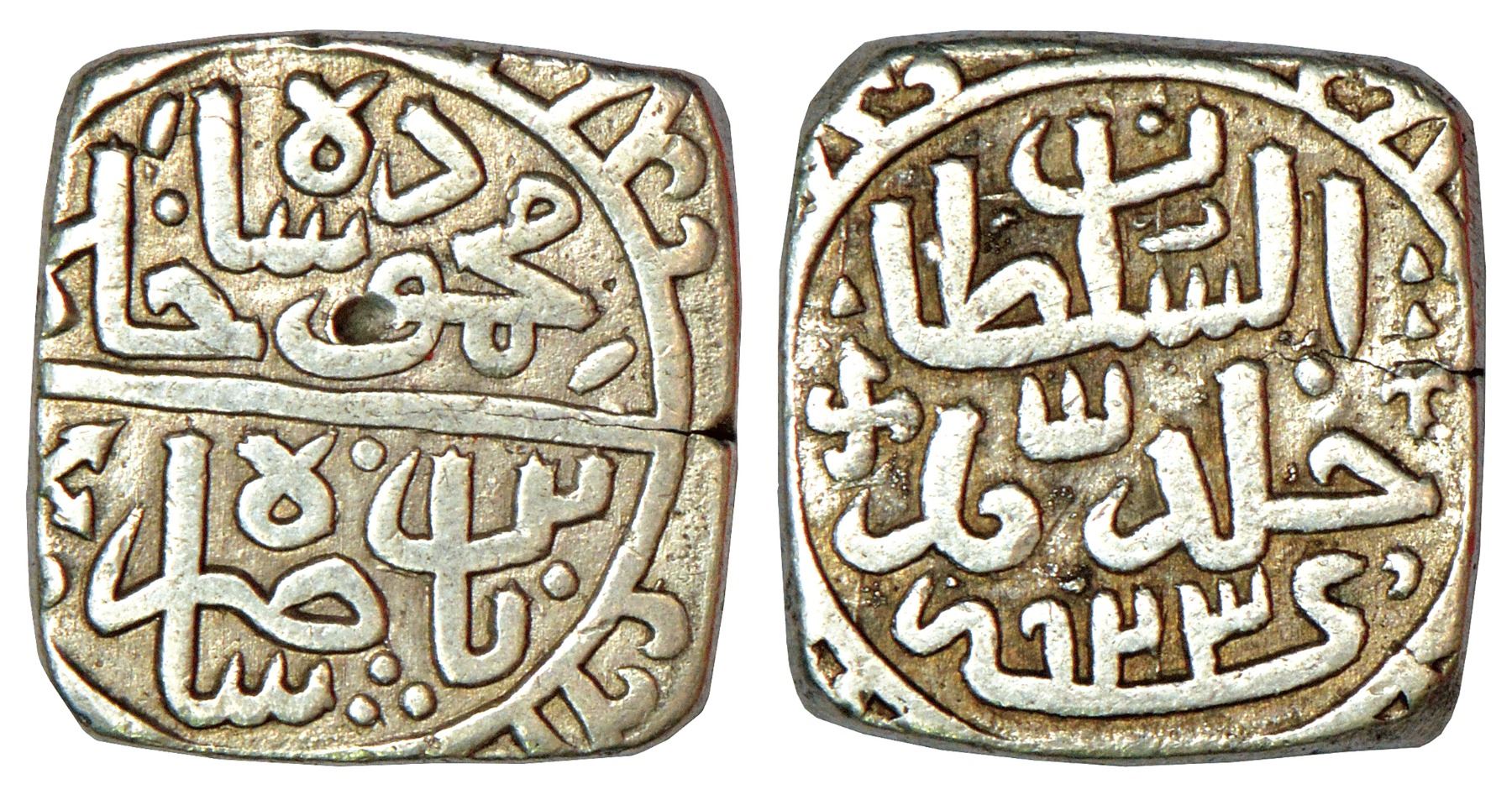 Sultans of Malwa - Silver square ½ tanka of Mahmud Shah II (1510-1531 AD), AH 923, swastika mint-mark on reverse, G&G M161, 5.16g. Obv: Arabic legend mahmud shah khalji bin nasir shah. Rev: Arabic legend al-sultan khallada mulkahu and date.